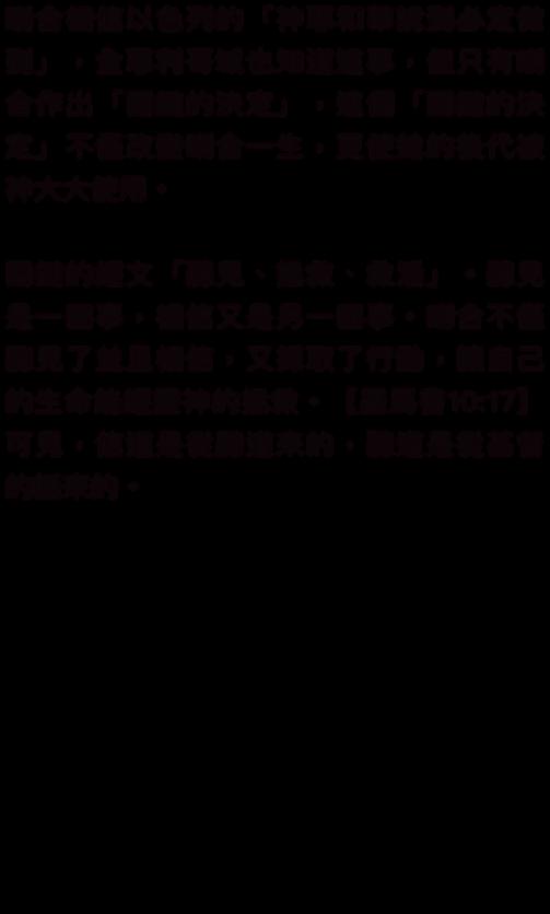 關鍵的經文「聽見、拯救、救活」。聽見 是一回事,相信又是另一回事。喇合不僅 聽見了並且相信,又採取了行動,讓自己 的生命能經歷神的拯救。 【羅馬書10:17】