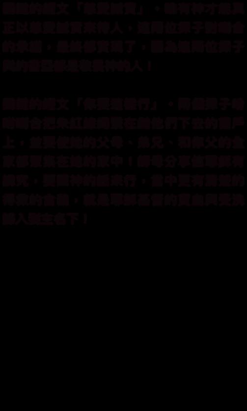 關鍵的經文「慈愛誠實」。唯有神才能真 正以慈愛誠實來待人,這兩位探子對喇合 的承諾,最終都實現了,因為這兩位探子 與約書亞都是敬畏神的人!