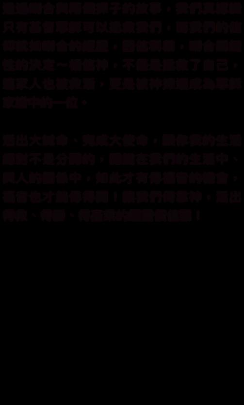 活出大誡命、完成大使命,跟你我的生活 絕對不是分開的,關鍵在我們的生活中、 與人的關係中,如此才有傳福音的機會, 福音也才能傳得開!讓我們倚靠神,活出 得救、得勝、得產業的屬靈價值觀! 結論、要有對話才有機會認識神