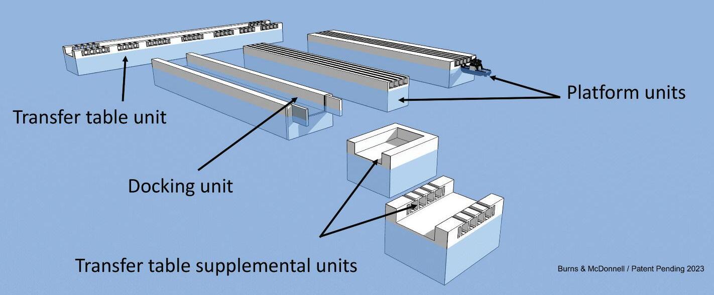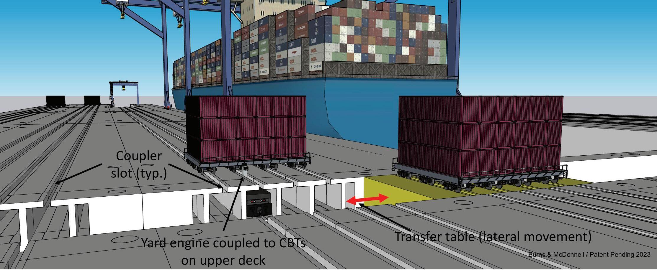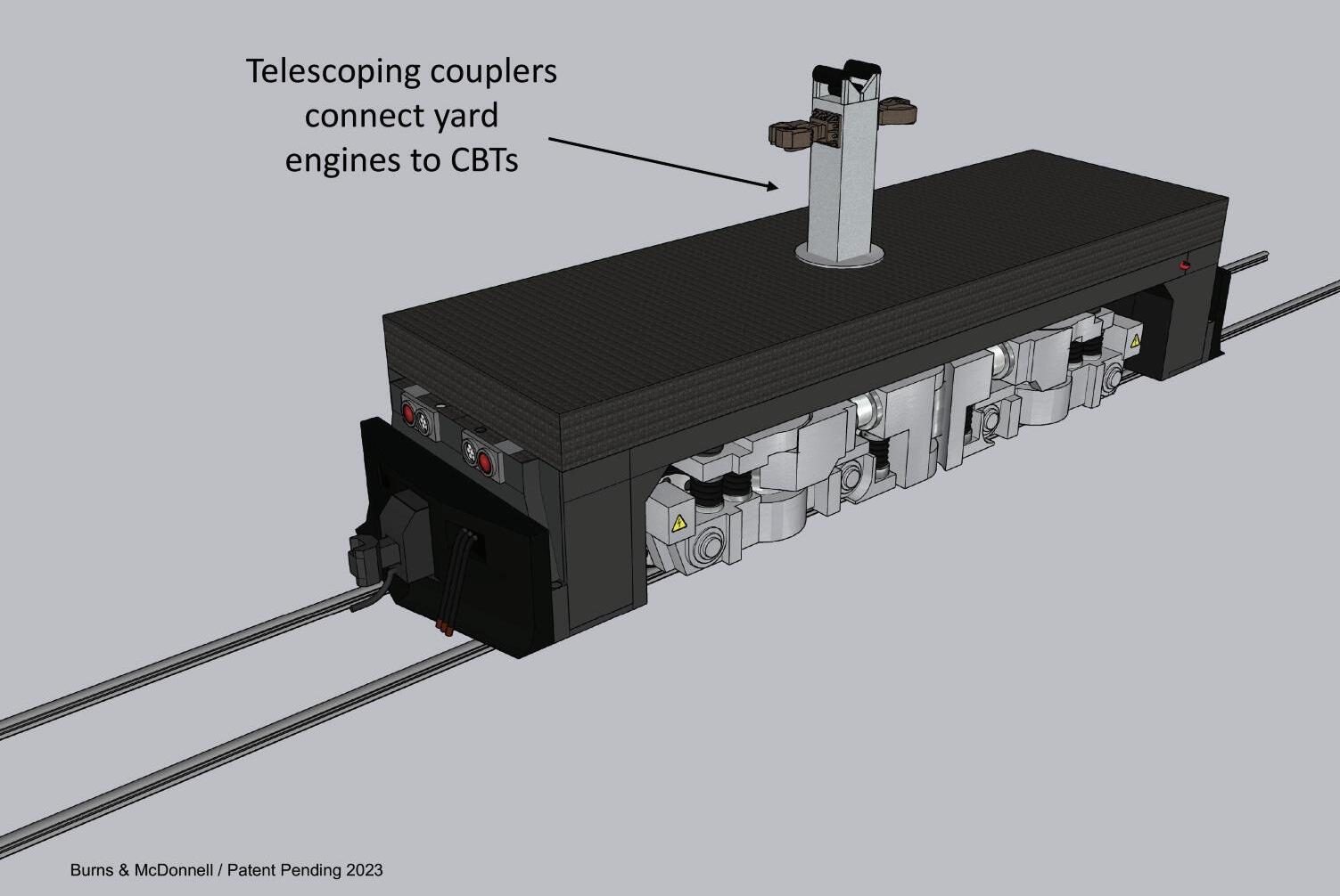 The CBTs are moved as unit trains or individually by battery electric wireless charging yard engines (Figure 7) which travel on the platform’s lower deck In this way, the yard engines can freely move about and position the CBTs under the STS cranes or on the barges. The yard engines are fitted with a telescoping (retractable) coupler mechanism When the coupler arm is retracted, the yard engine can travel beneath the CBTs. Hence , when a yard engine arrives at a CBT that needs to be moved, the telescoping coupler can be extended through a slot in the main deck tracks and couple to the CBT Multiple yard engines can work in tandem to jointly move a barge load of ten CBTs (180 containers).