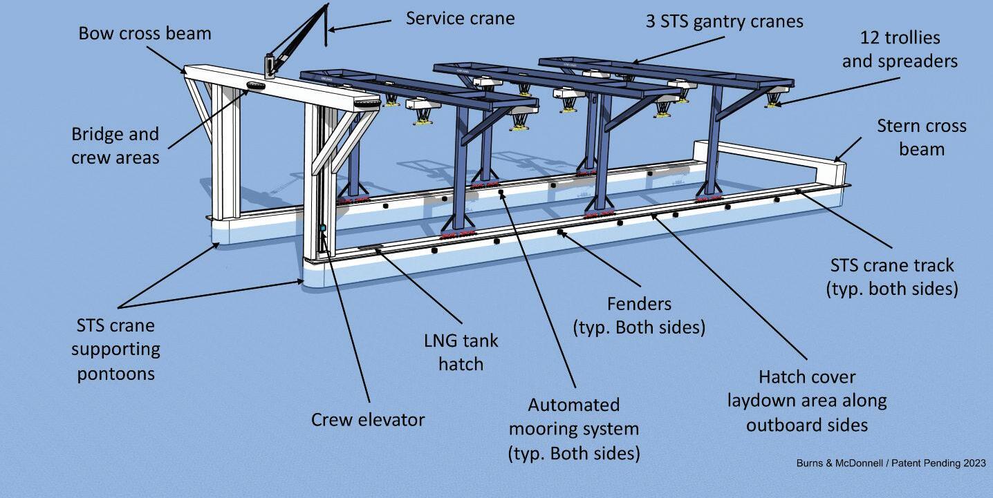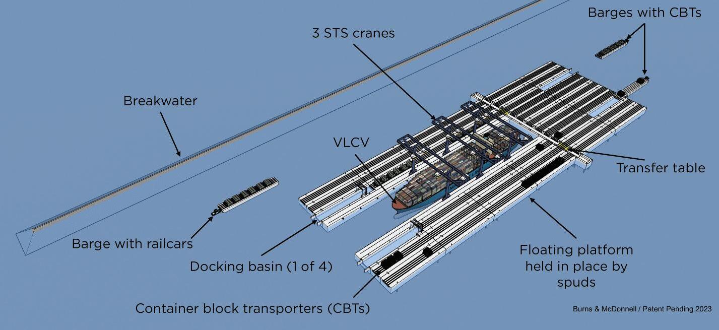 One way to increase aport’s throughput and functionality is to create a complementary offshore - very large container vessel(VLCV) capable - floating terminal. This, and in some locations, given the heightened need to site provisional offshore wind (OSW) turbine fabrication and assembly facilities within some landconstrainedports, creates a unique business opportunity and an engineering challenge. This article, by Reece Shaw ofBurns &McDonnell, describes the Floating Automated Ship-to-Ship Terminal (FASST®) which meets these challenges.