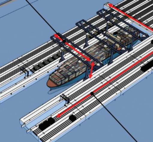 Fur ther, when used for container transfer to-and-from VLCVs it significantly increases the potential deliver y of containers to-and-from ships by train and reduces container double handling by container bundling and direct to rail loading. When used for OSW turbine fabrication and assembly it can be configured to suppor t the building of the various floating