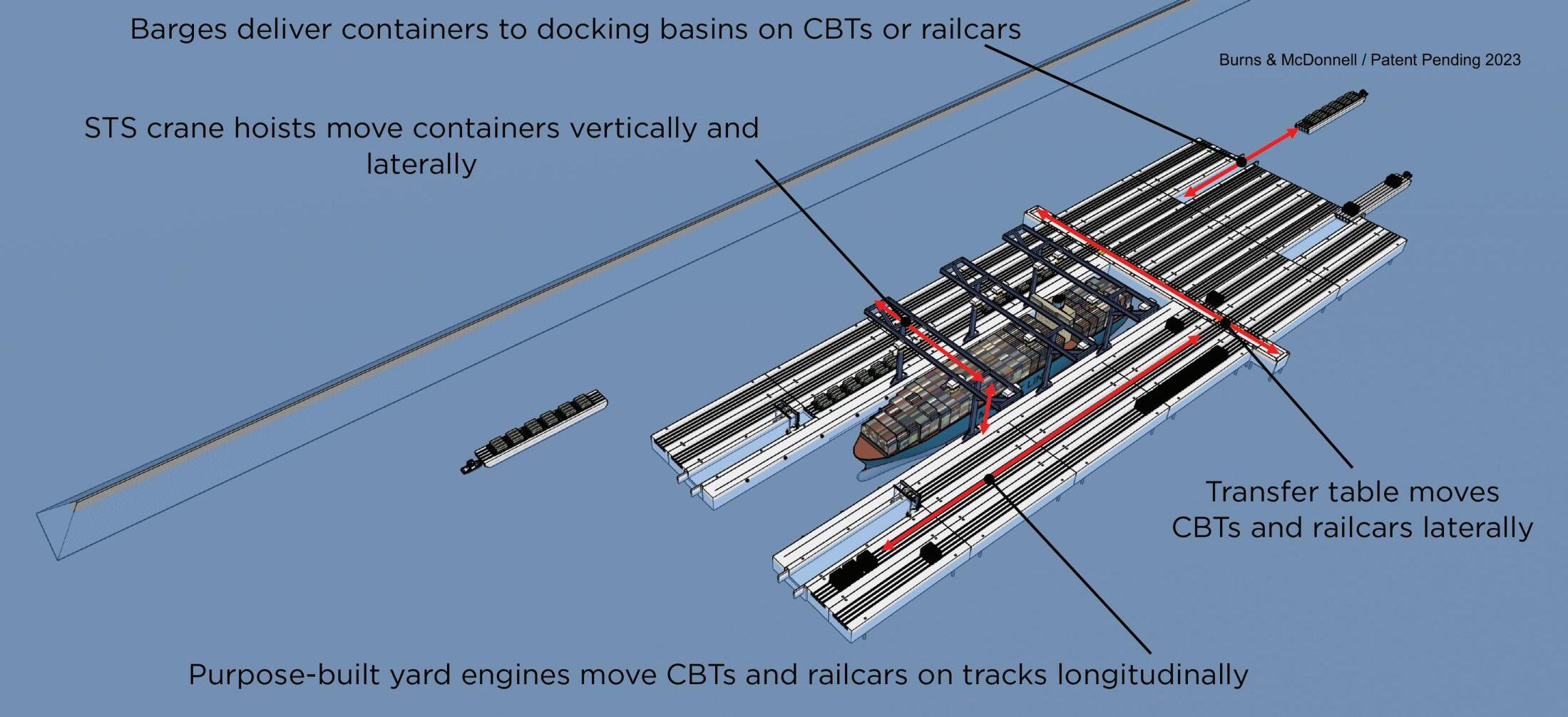Transpor ters (CBT) system, (7) purpose-built yard engines, and (8), purpose-built barges Each of these elements are described below.