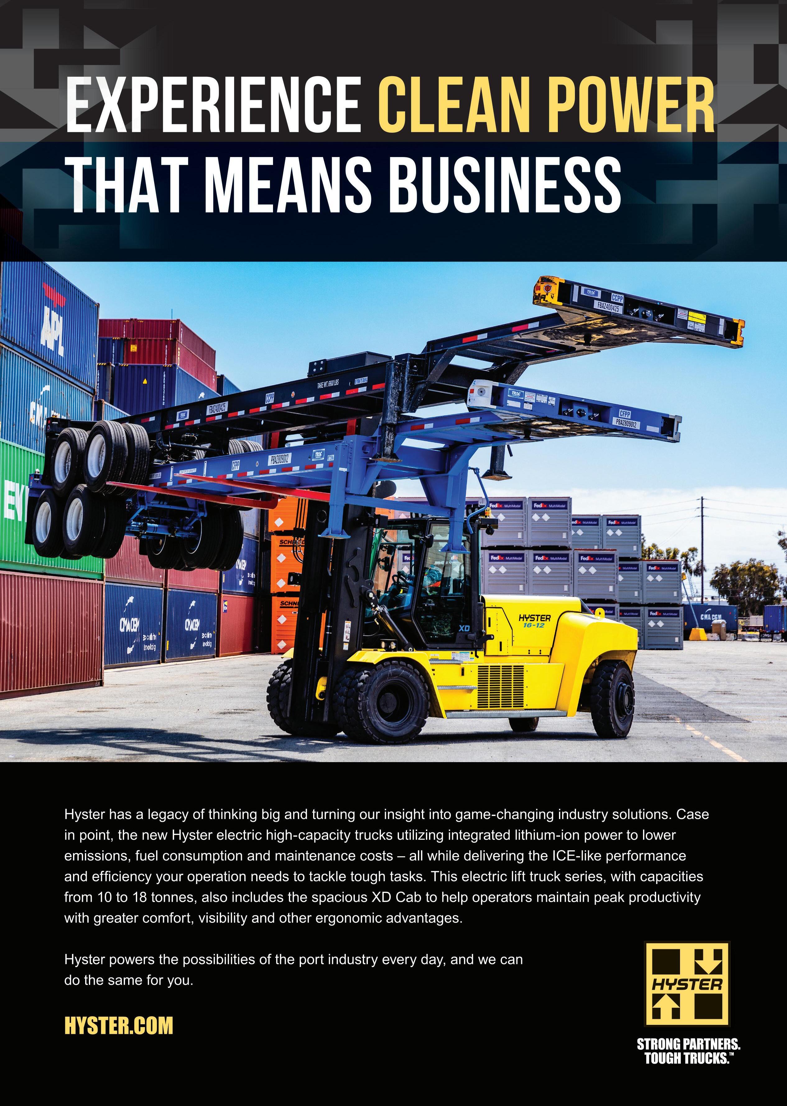 all-time high of 341,611 TEUs The por t’s focus on its sustainability programme and becoming a net-zero carbon emissions operation by 2040 also advanced New capital projects using electric equipment coupled with power purchase agreements from exclusively clean energ y production has the por t on track - and in some areas ahead of schedule - to meet is 2040 goal.