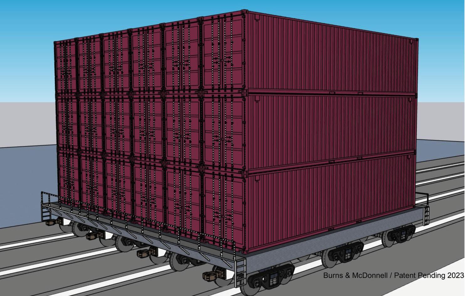 Container Block Transpor ters (CBTs) are designed to reduce container rehandling by holding up to eighteen for ty-foot containers each (Figure 6) They are 15 m (50-ft) long x 12 m (40-ft) wide and are fitted with couplers and brakes. The transpor ters ride on twelve railcar trucks distributed over four sets of standard gage railroad tracks Ergo, the purpose-built barges and the platform itself are also outfitted with sets of four parallel tracks These tracks allow for direct container-to-rail loading and unload when railcars are placed on the barges and brought to the offshore platform