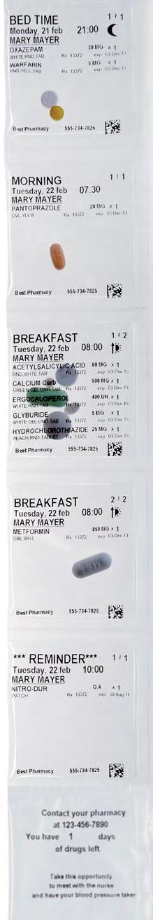 • Improve patient’s medication adherence with daily medication pouches and optional reminder pouches for medications external to the pouch (e.g. a nitroglycerin patch).