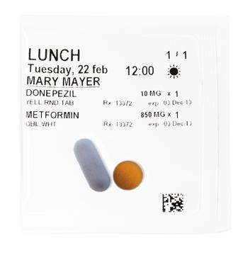 Medications organized by date and time, securely sealed in individual easy-to-open portable pouches.
