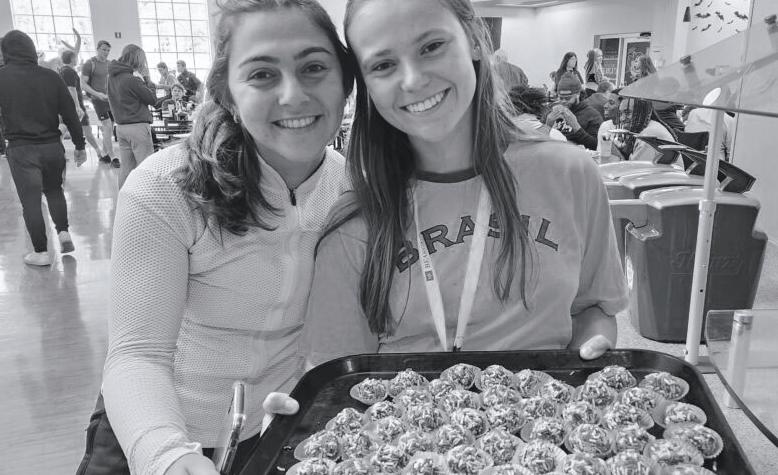 MARIA POSES WITH , A SOPHOMORE FROM BELO HORIZONTE, BRAZIL. THEY ARE HOLDING A TRAY OF BRIGADEIRO, A TRADITIONAL BRAZILIAN DESSERT.
