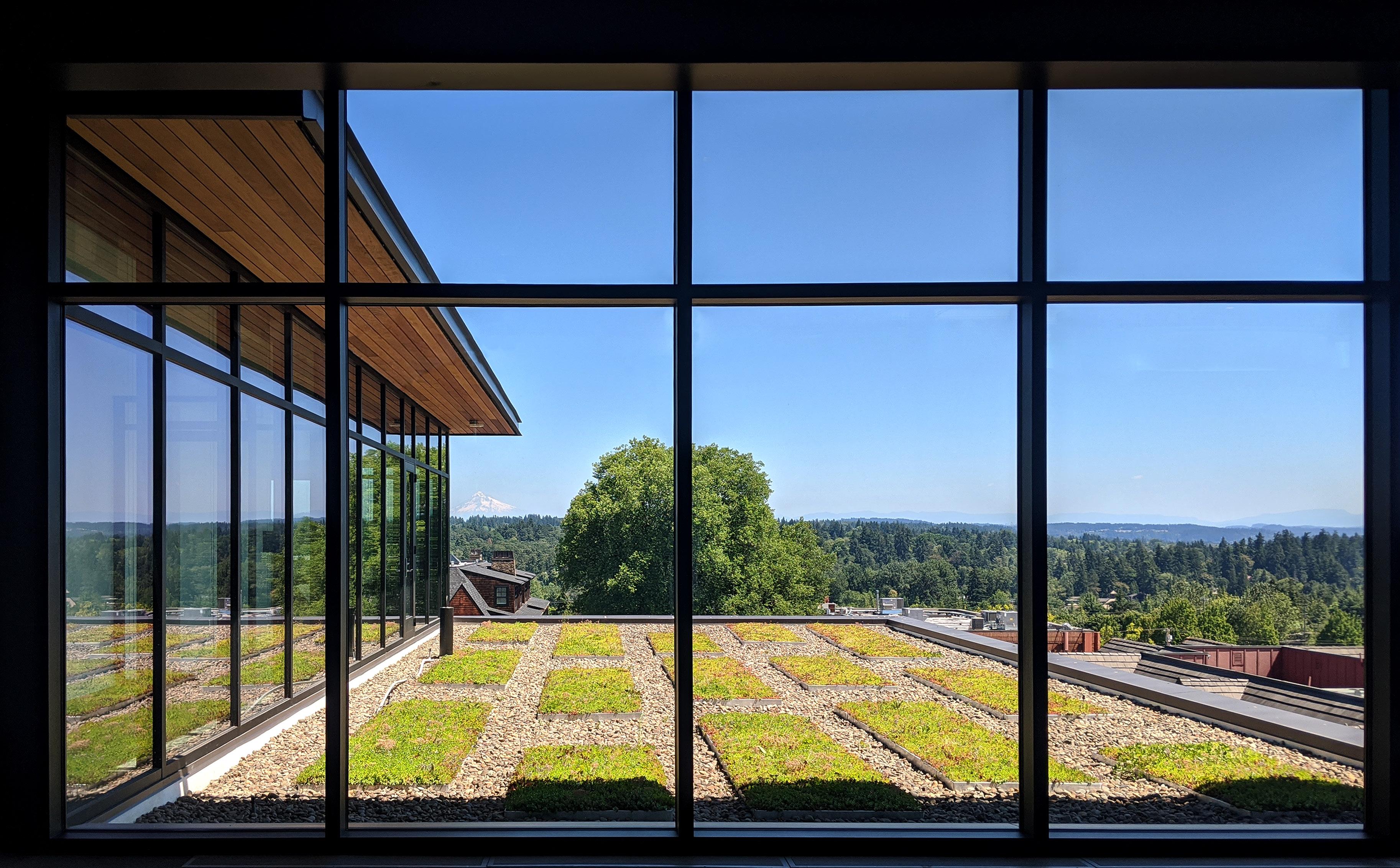 The design for One Main Place in Portland, OR utilized green roof to reduce water runoff and the heat island effects.