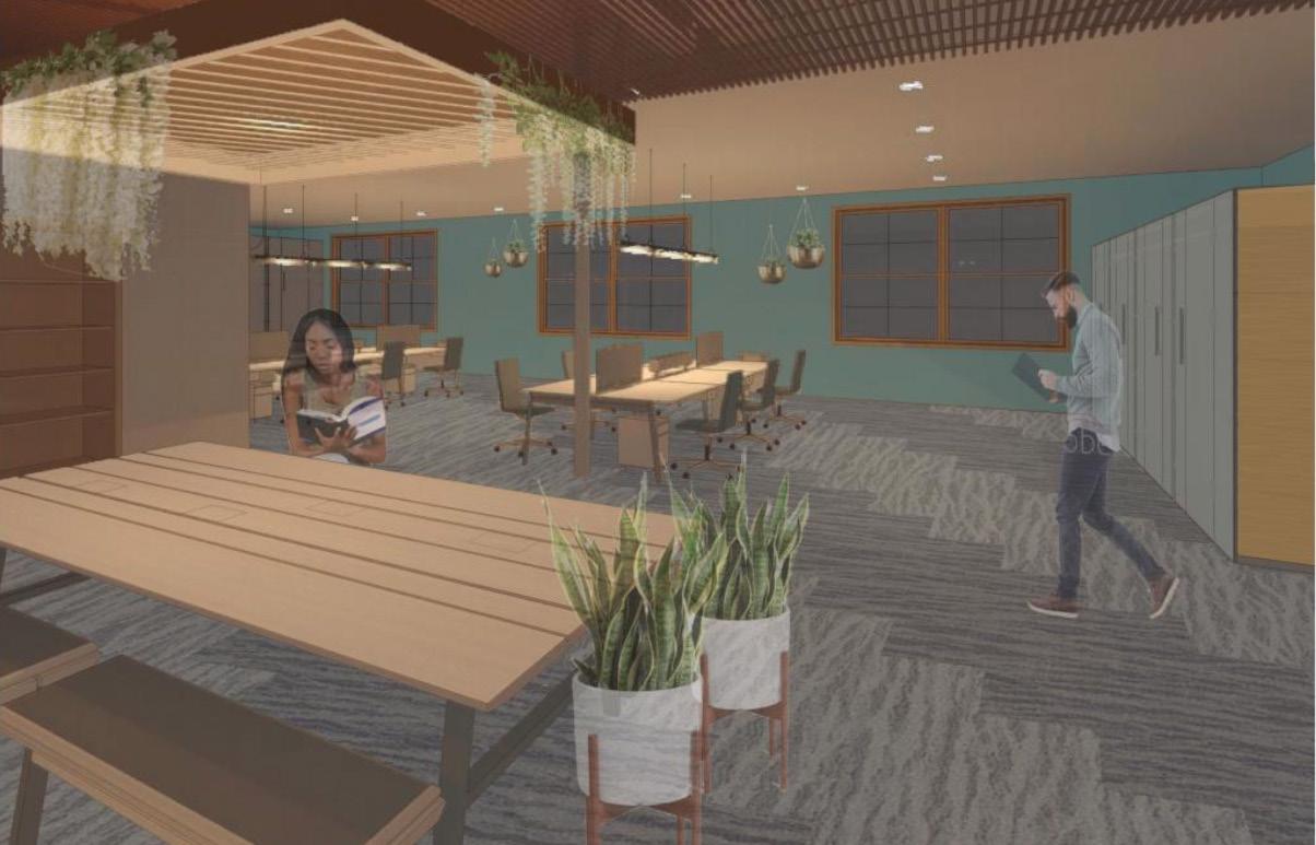 Bookcaseshouseacollectionofcookbooks,cocktailguides,andothertake-one-leave-oneliterature.Apicnicstyletable providesaquickseatwhileworkstationsandpodsnearbyprovideareastofocusorcollaborate.