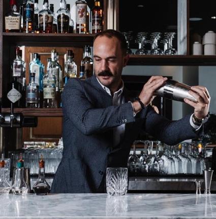 Alongside the main bar is a group of community tables where guests can meet and enjoy spontaneous conversation.