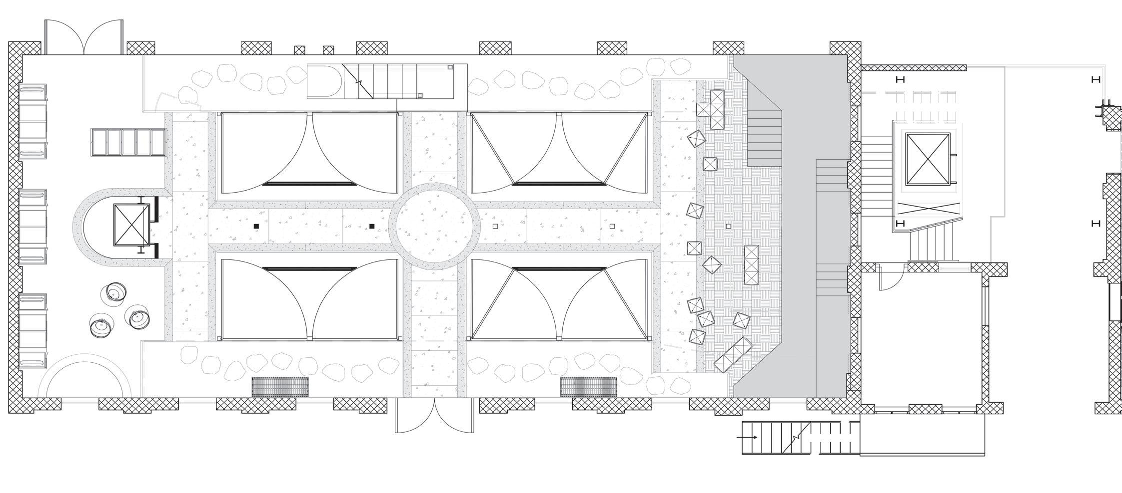 Oppositefromthestage,onthemezzanine,isatheater withtieredseatingtowatchperformances.