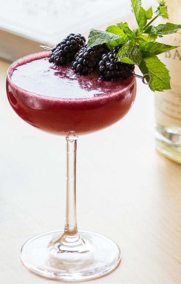 Muddle blackberries and honey syrup. Add remaining ingredients and shake. Double strain into a coupe glass with fresh blackberries and mint garnish.