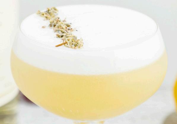 Dry-shake ingredients without ice. Shake again with ice and double strain into a chilled cocktail glass. Top with crushed lavender.