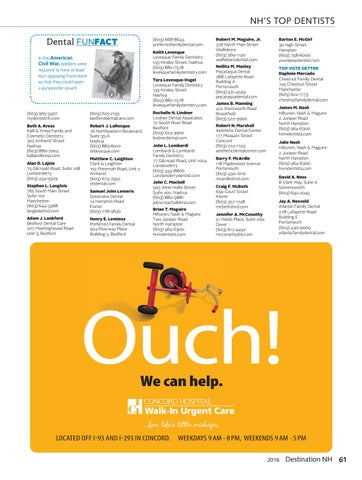 Rochelle H. Lindner Lindner Dental Associates 72 South River Road Bedford (603) 624-3900 lindnerdental.com John L. Lombardi Lombardi & Lombardi Family Dentistry 77 Gilcreast Road, Unit 1004 Londonderry (603) 434-8800 Londonderrydentist.com John C. Machell 505 West Hollis Street Suite 202, Nashua (603) 882-9881 johncmachelldmd.com Brian T. Maguire Hiltunen, Nash & Maguire Two Juniper Road North Hampton (603) 964-6300 hnmdentists.com