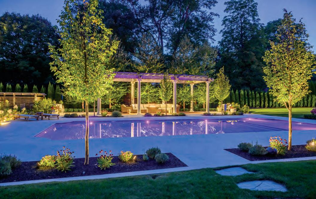Above: Dramatic lighting transforms the pool area at night, creating a magical vision.