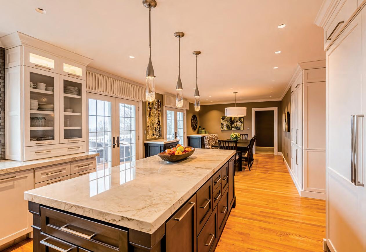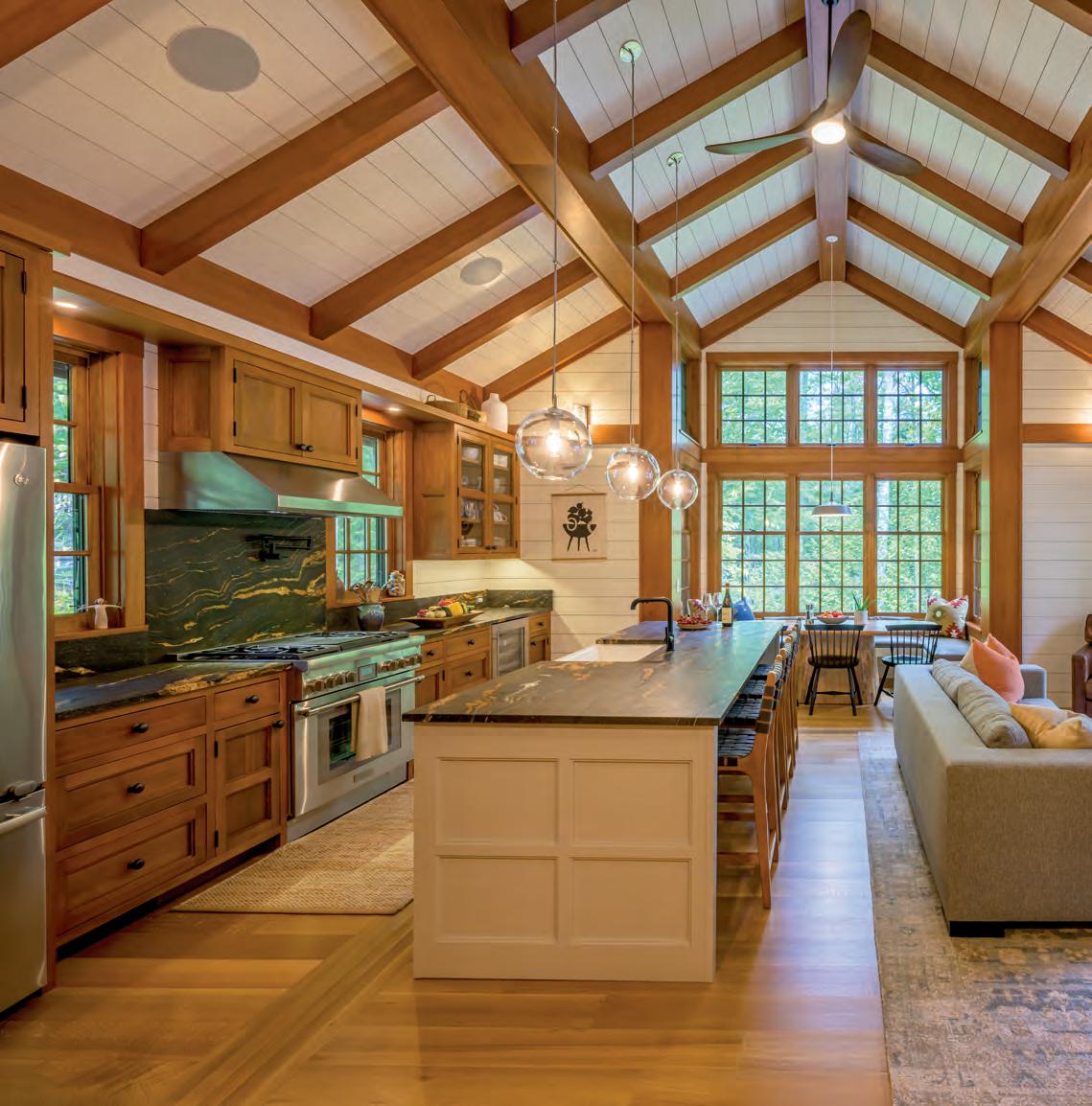The kitchen is fully applianced and defined by the L-shaped island. Pendant lights here and elsewhere are reminiscent of schoolhouse fixtures.