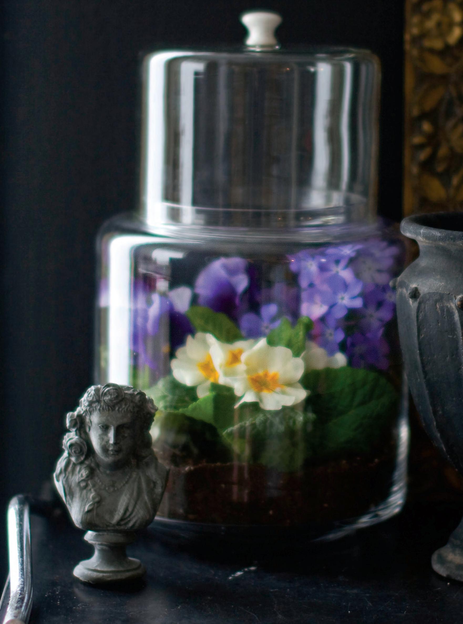 A great way to usher in a new season and inexpensively up-style your home is using tabletop items filled with flowers. Galvanized containers, glass jars and boxes are all useful for making mini garden displays. Flowering plants, bulbs, herbs and mini shrubs can be combined in a container to create a centerpiece or focal point.