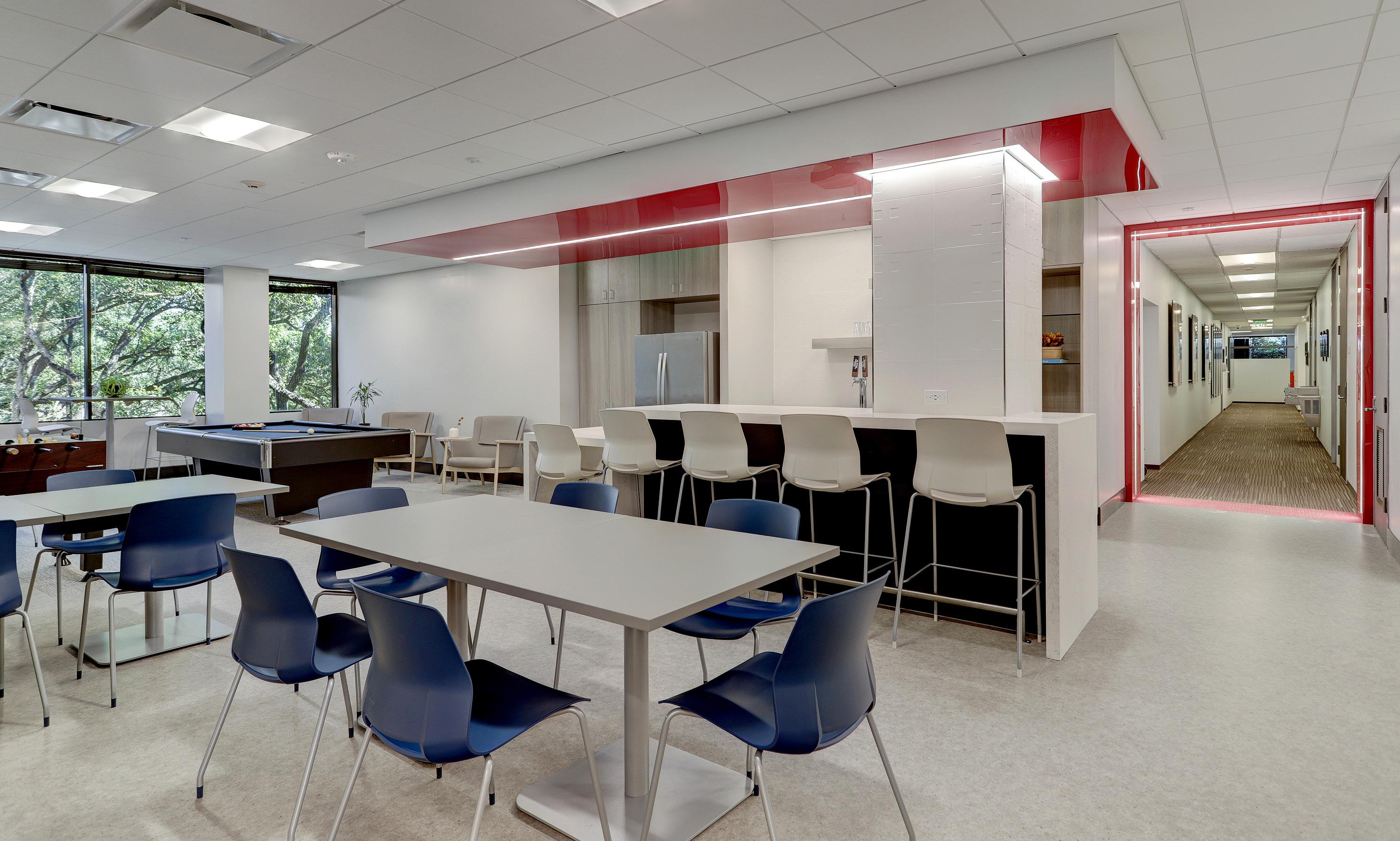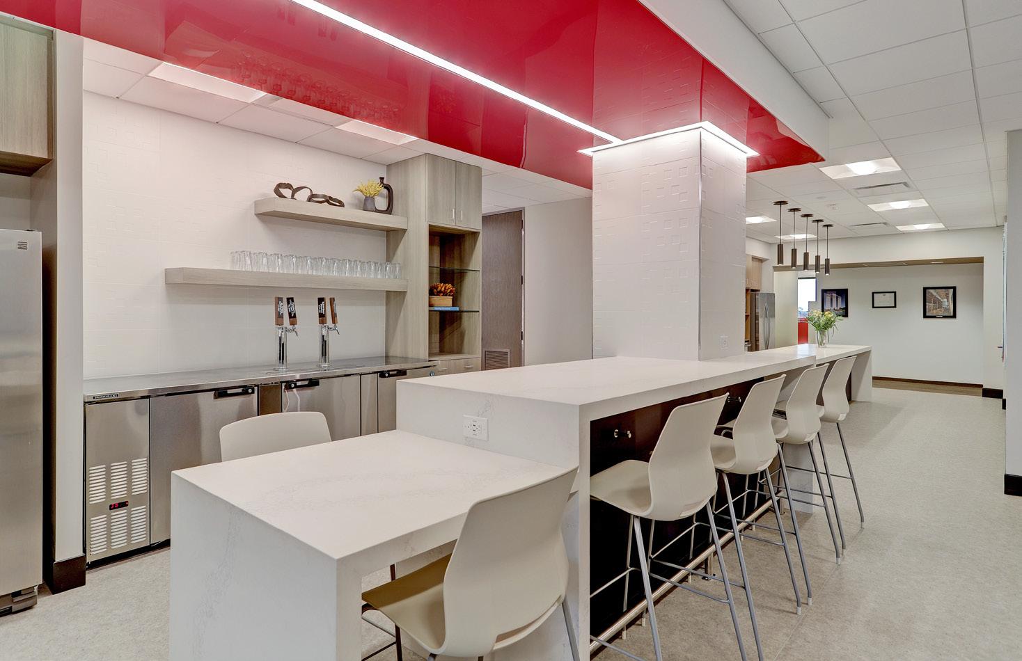 At the heart of the workspace, the game room/breakroom provides an array of gathering spaces to support communal interaction. The space incorporates vivid accents of reds to emphasize the corporate identity of DBR Engineering. The modern theme provides a welcoming environment that includes a variety of seating and game tables. Additionally, the integration of two large islands offers ample counter space to ensure the breakroom is ideal for a large gathering, a mid-afternoon break, or an after-hour drink.