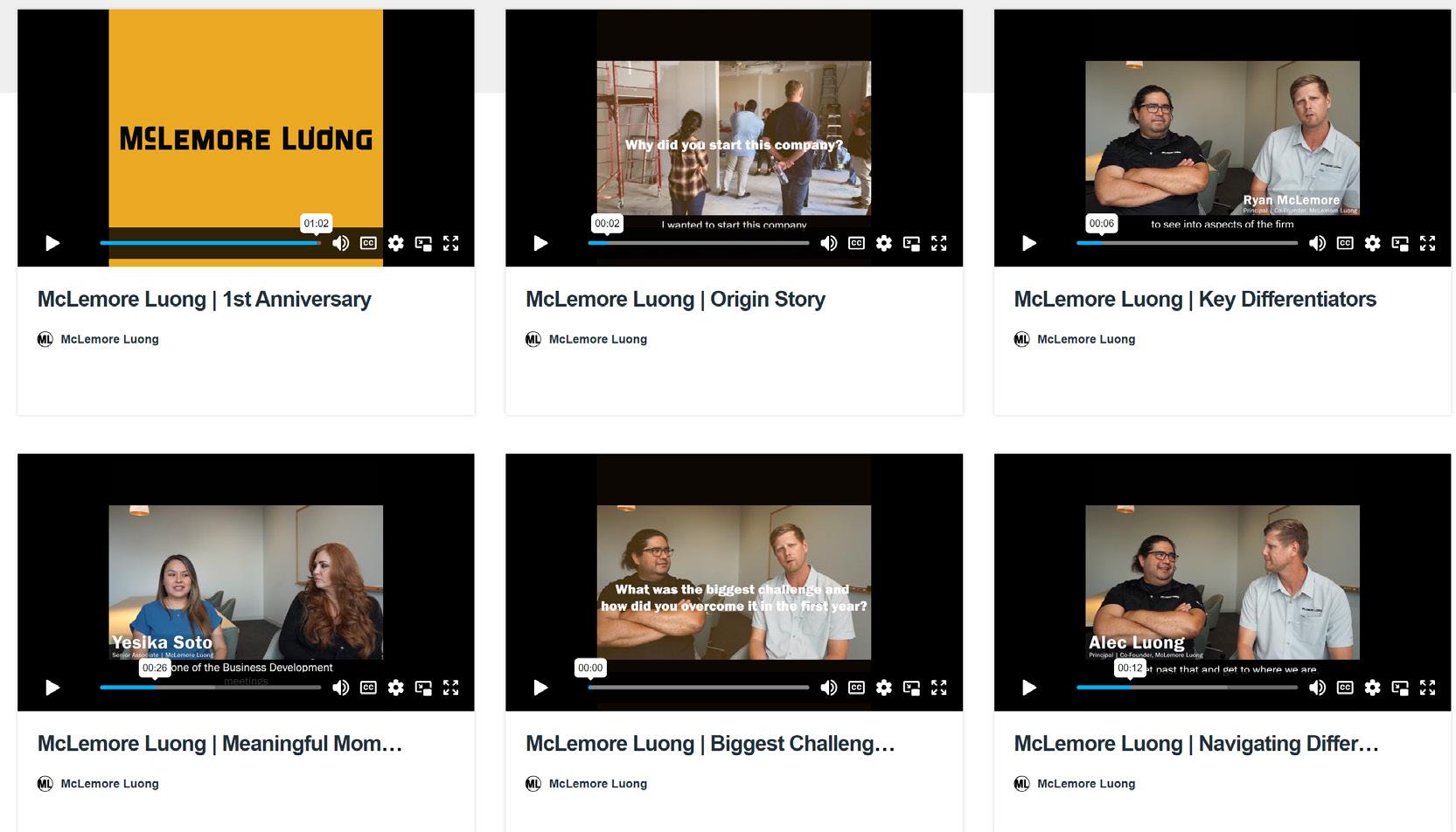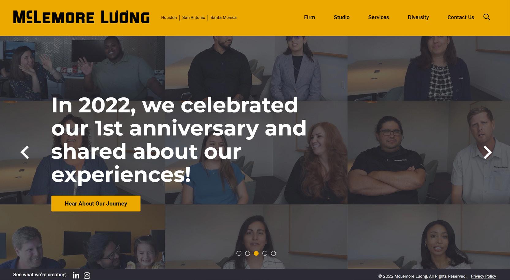 We celebrated our 1st Anniversary in 2022. To commemorate the occasion, we filmed interviews with principals, senior associates, and design professionals exploring different topics we encountered throughout the year. From our origin story to our biggest challenges to our most memorable moments, we shared what makes McLemore Luong different and showcased why we chose the tagline "Great People Creating Better Architecture."