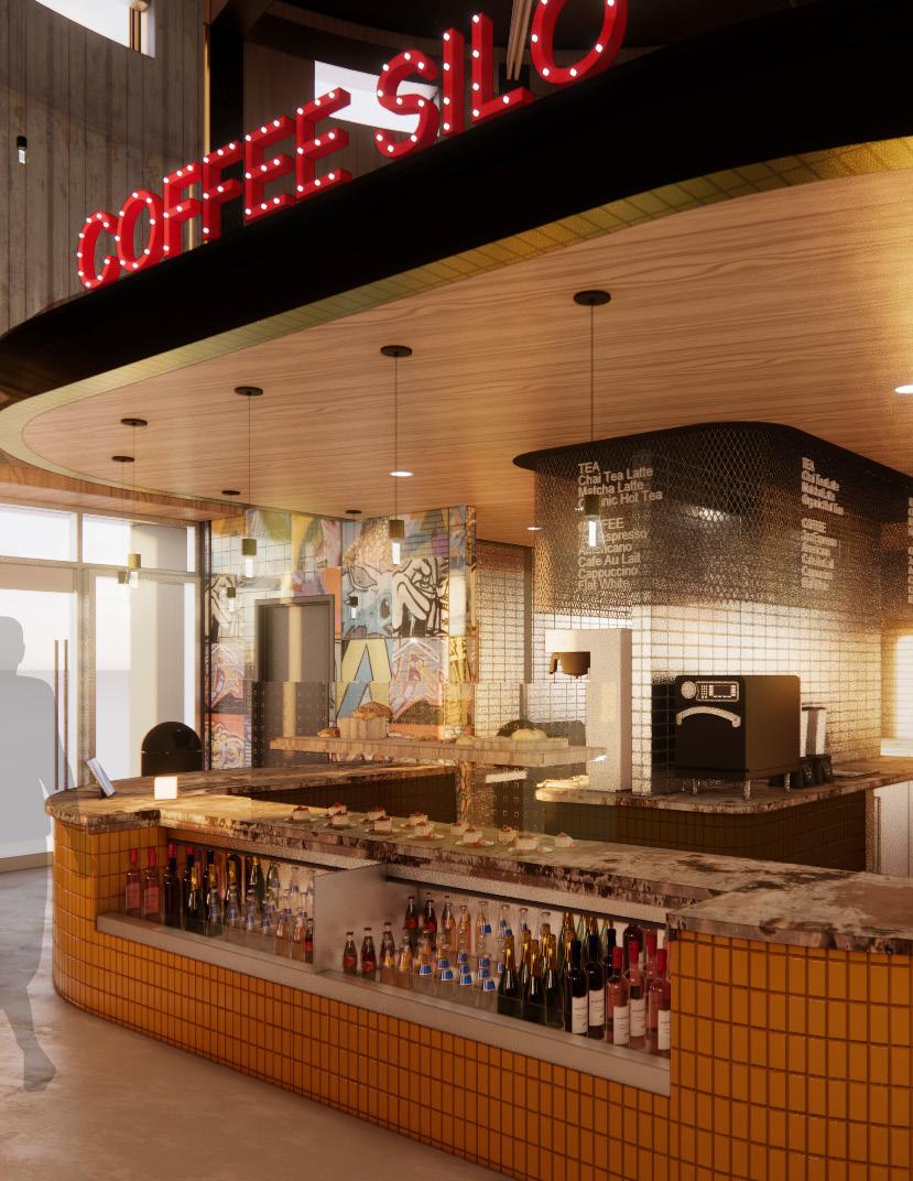The new Coffee Silo will be the go-to meet-up place for a diverse group of residents in the neighborhood. Located along the AMP (Alternative Mobility Path) and nestled within the walkable community, a resident can enjoy a grab-and-go coffee and breakfast on the way to work and settle in for a nightcap and snacks in the evening on the way home. The design features indoor and outdoor serving areas, a feature countertop, and an open serving area facing private seating booths nestled inside a steel silo structure filled with light.