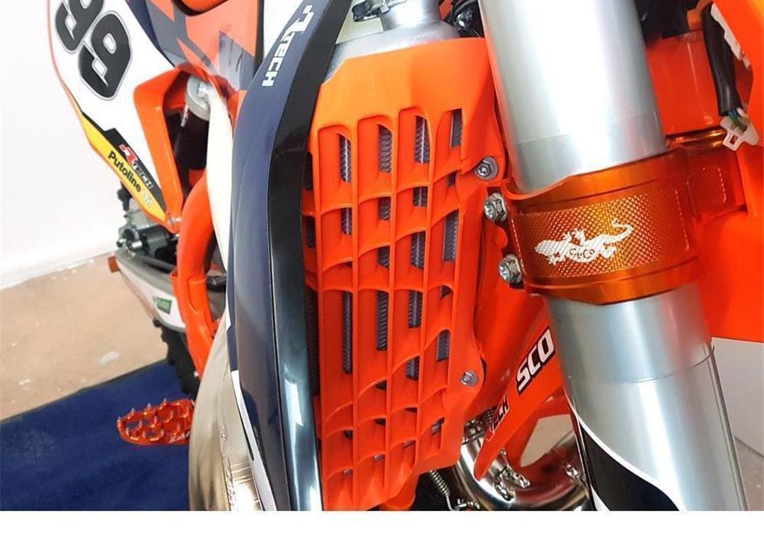 Select options have additional reinforcing ribs and perimetral hexagons on the back side granting an increased resistance in case of crashes or impacts. It also avoids contact with the shroud on the top to avoid the damaging of the radiator aluminium by the plastic. Horizontal lower radiator protection prevents the collision between pipe and radiator on 250-300cc 2 stroke models.