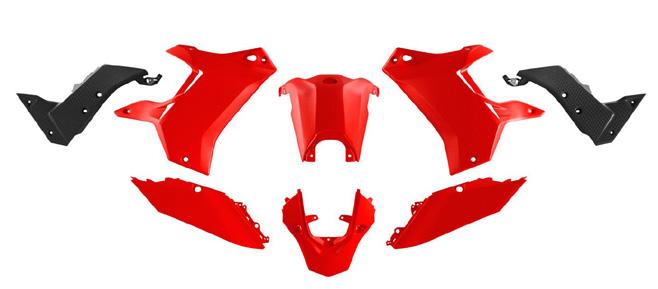 • Eight piece kit includes two shrouds, gas tank cover, two central side panels, two rear number plate side panels and rear fender