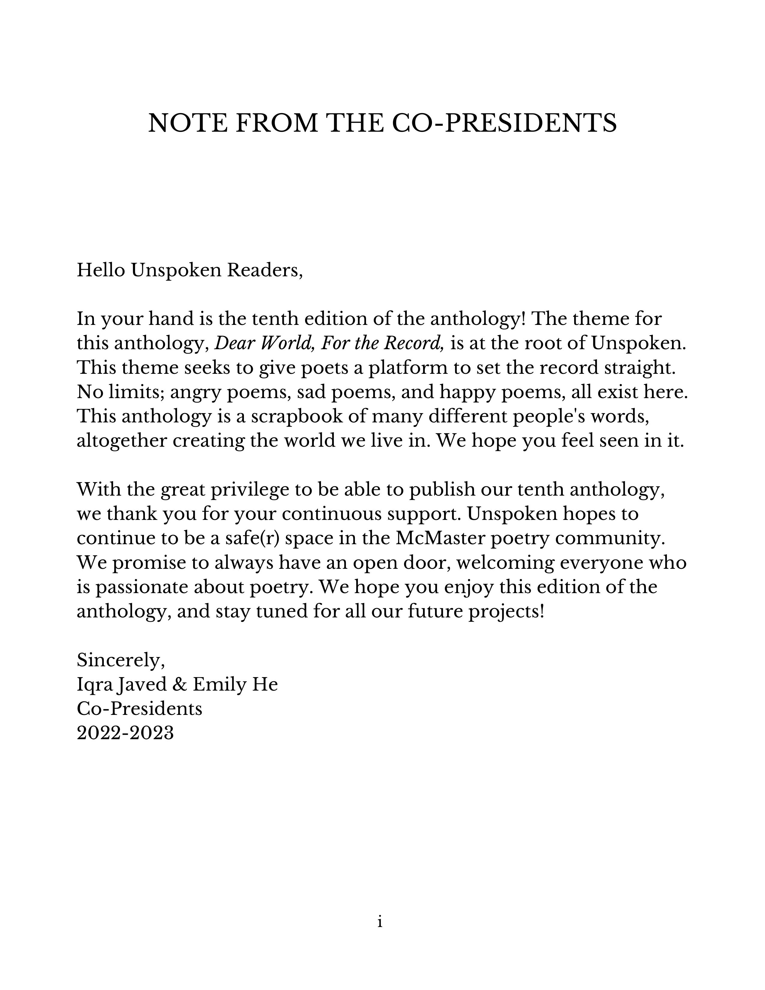 Unspoken - No. X, Dear World for the Record (Winter 2023) by McMaster Unspoken - Issuu
