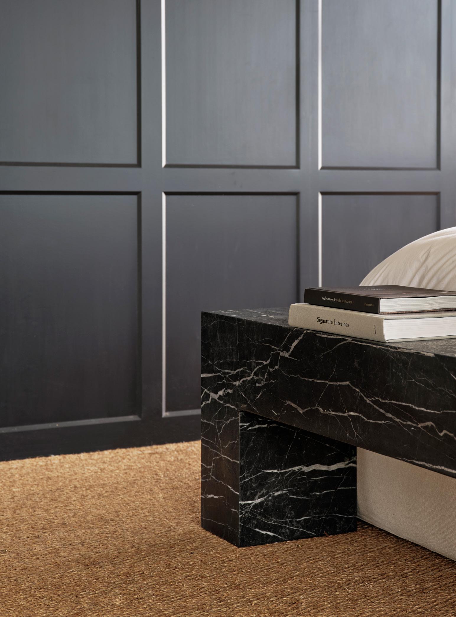 THIS PAGE Monument Lowline Console - Nero Maquina Black Marble OPPOSITE PAGE Donato Occasional Chair - Pavlova, Pronto Side Table - Green Marble