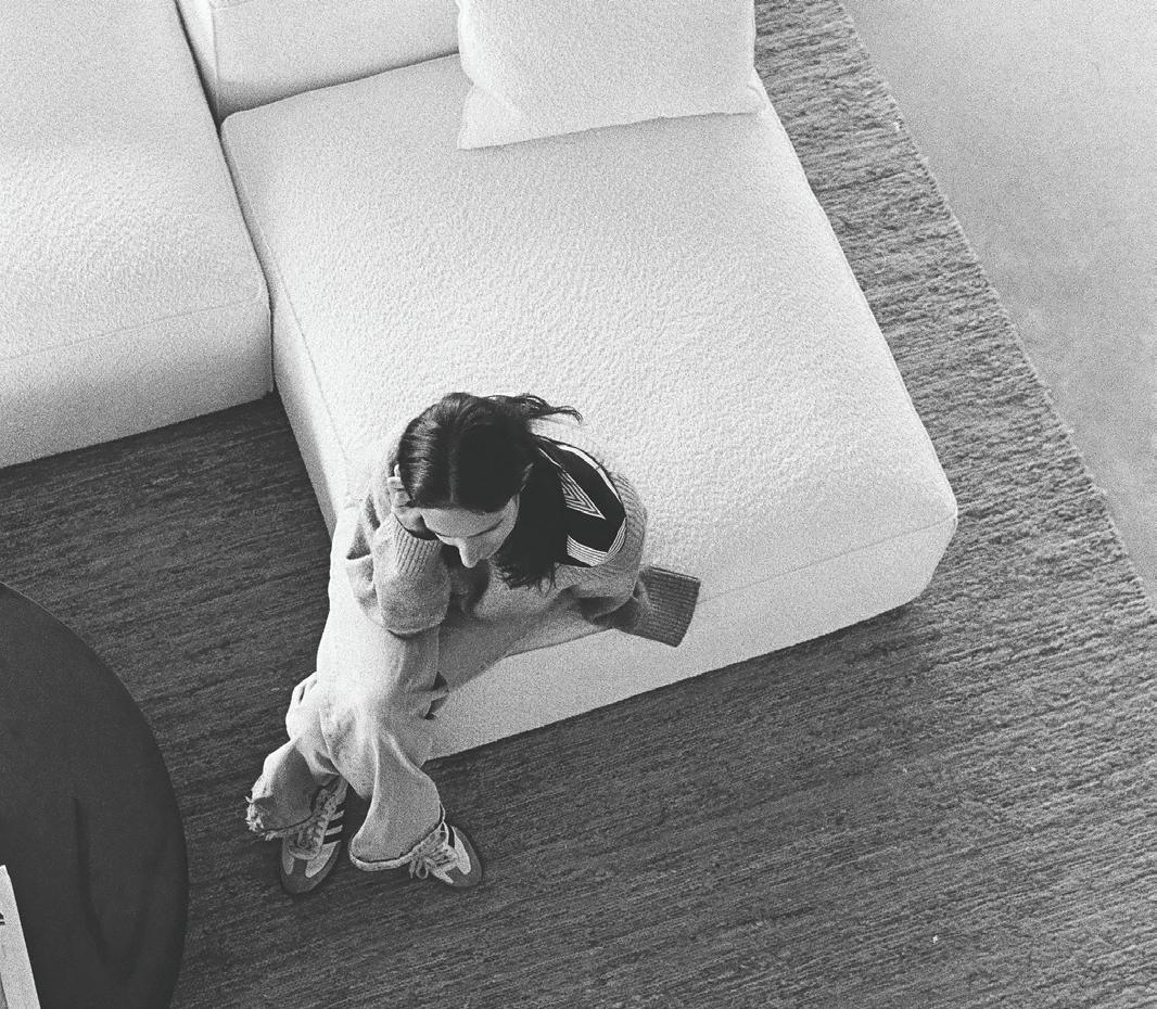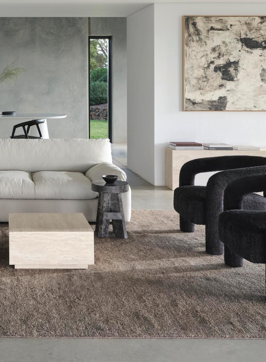 In smaller spaces, a more compact rug can be just as impactful. Positioning furniture around, rather that on top of the rug, allows the materiality and shape to stand out creating a calm, intentional, and considered space.