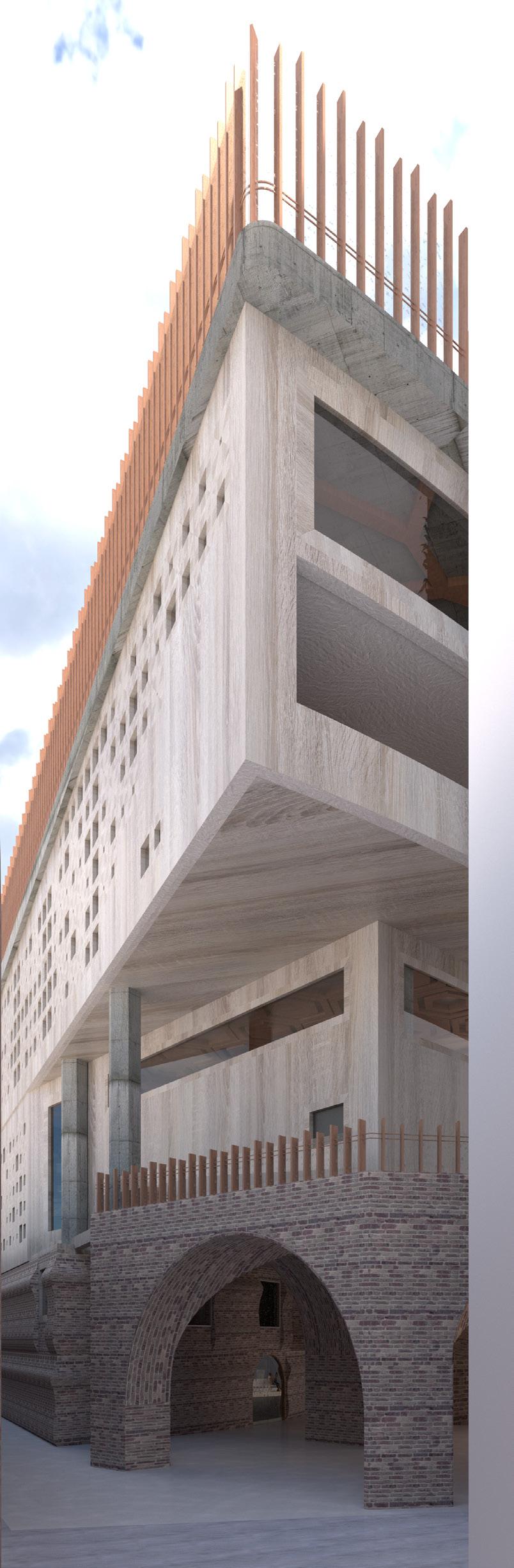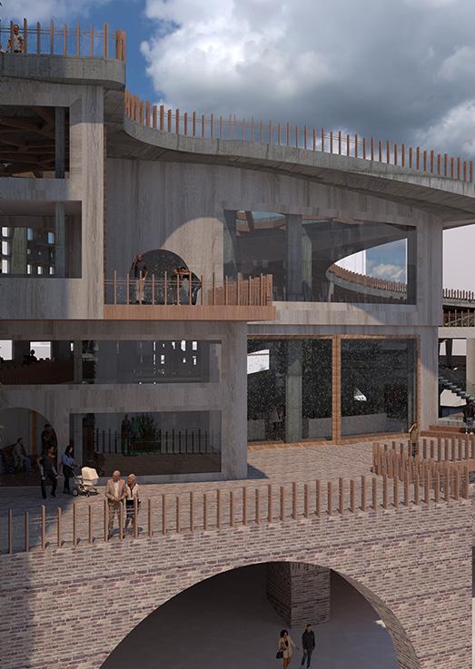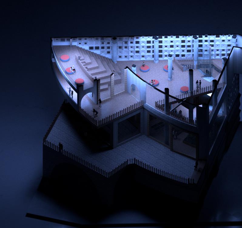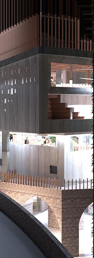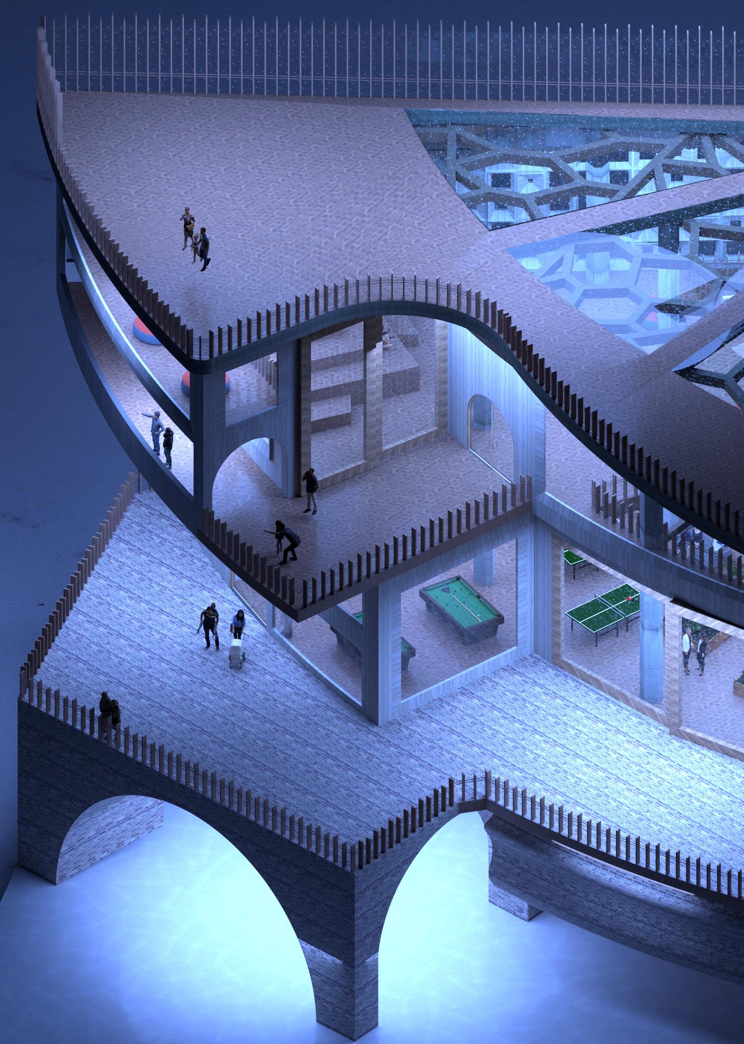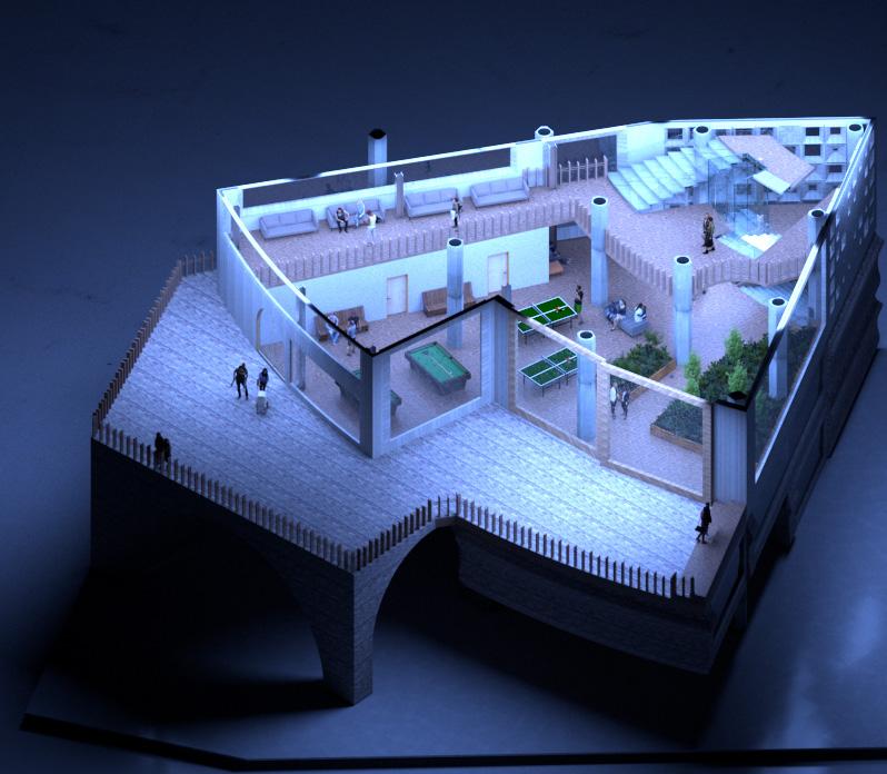 The community centre will consist of 4 Levels, including the ground floor, and will harbour a range of activities. The top two floors will be aimed at providing an area in the city where people can come and spend time as well as providing a space for events, the exterior façade will be wood in order to contrast with the bottom half and echo the elevated park’s green aspects. Whereas the lower floors will be dedicated to providing an area for admin and educational work as well as a reception area, the interior and exterior finish will be thin 15mm thick brick in order to bring out and fit in with the prevalent material of the area used on the neighbouring train track arches and buildings, while not adding much weight to the structure.