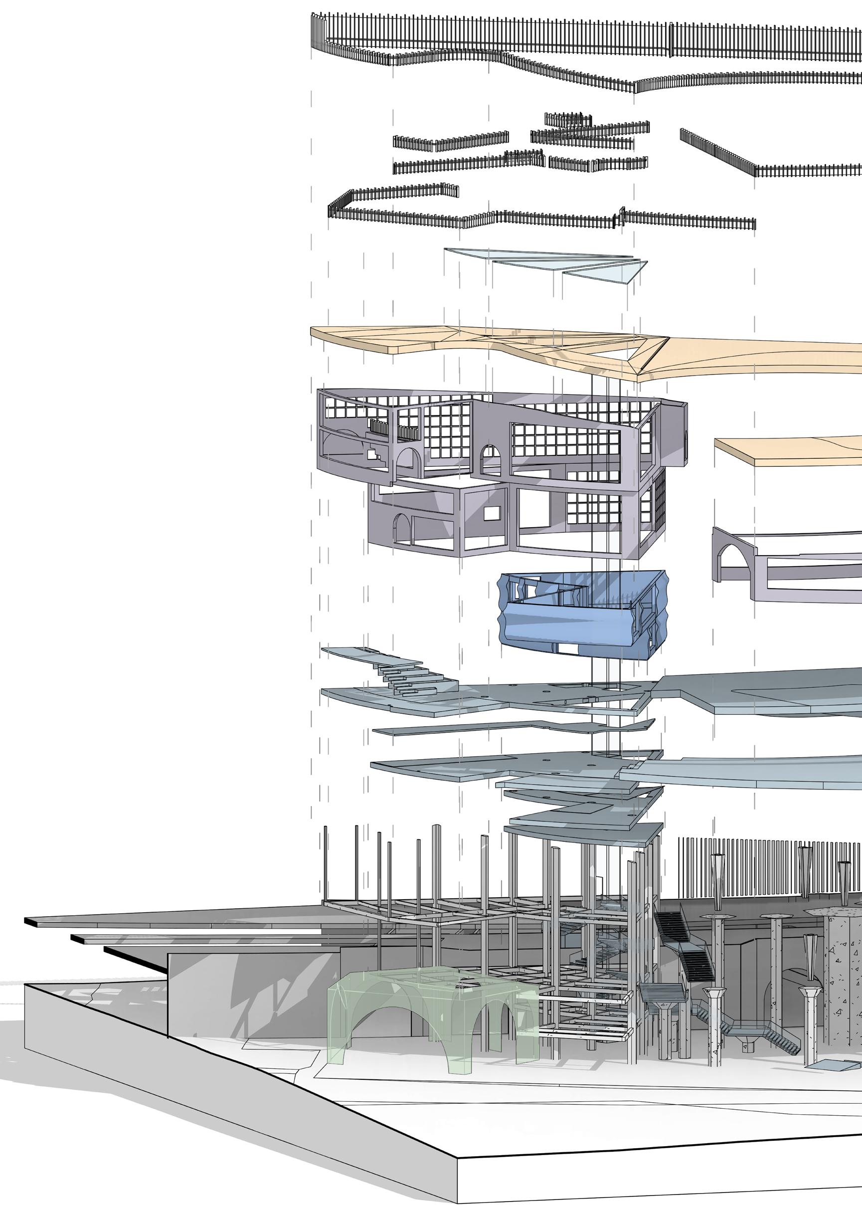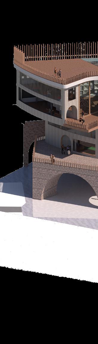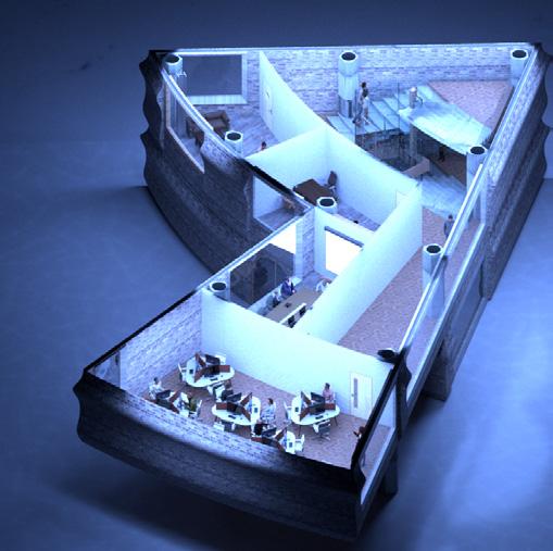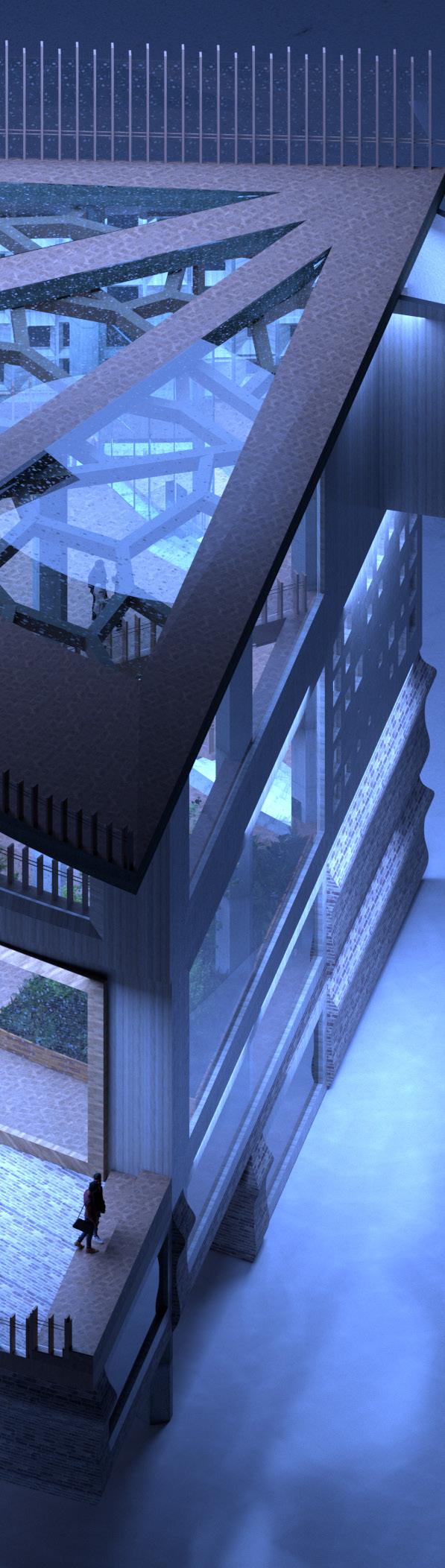 The community centre will consist of 4 Levels, including the ground floor, and will harbour a range of activities. The top two floors will be aimed at providing an area in the city where people can come and spend time as well as providing a space for events, the exterior façade will be wood in order to contrast with the bottom half and echo the elevated park’s green aspects. Whereas the lower floors will be dedicated to providing an area for admin and educational work as well as a reception area, the interior and exterior finish will be thin 15mm thick brick in order to bring out and fit in with the prevalent material of the area used on the neighbouring train track arches and buildings, while not adding much weight to the structure.