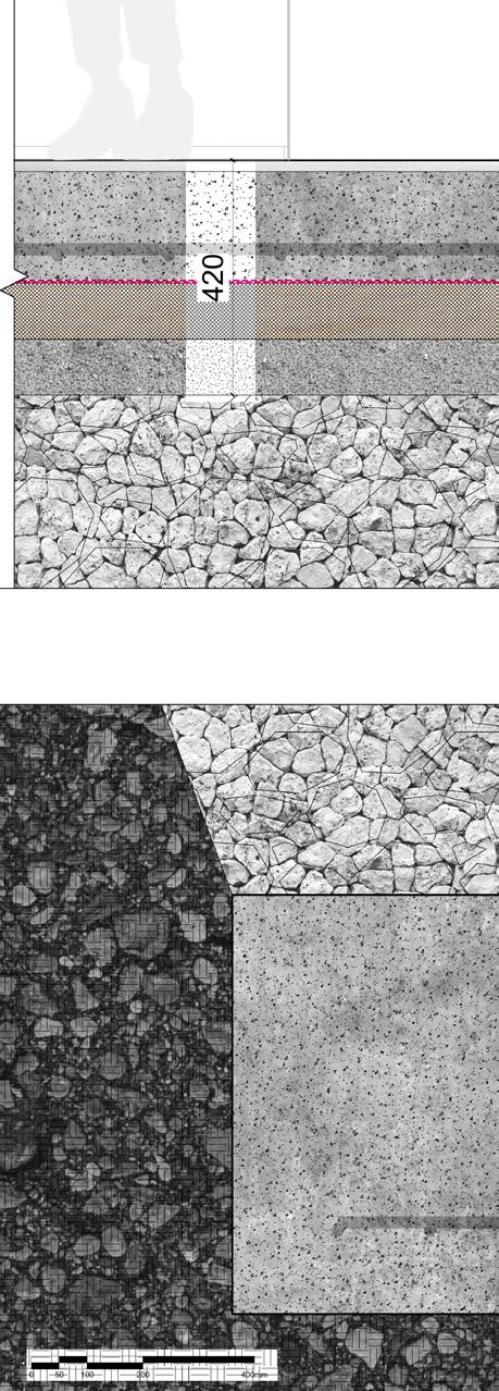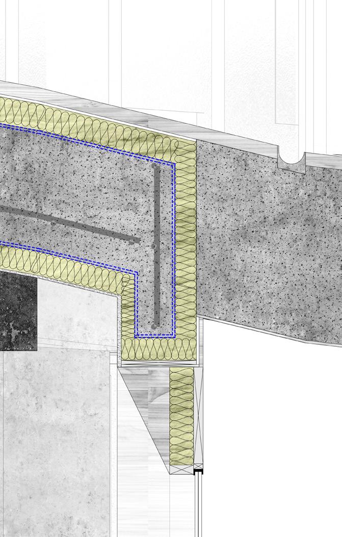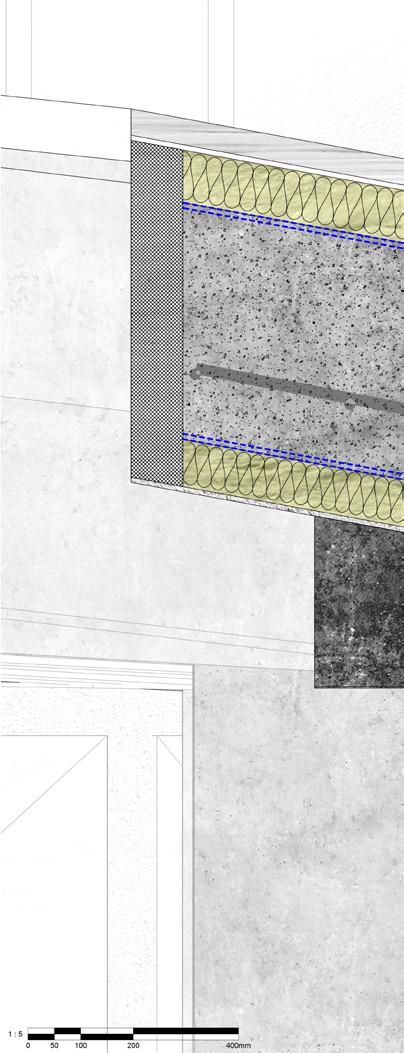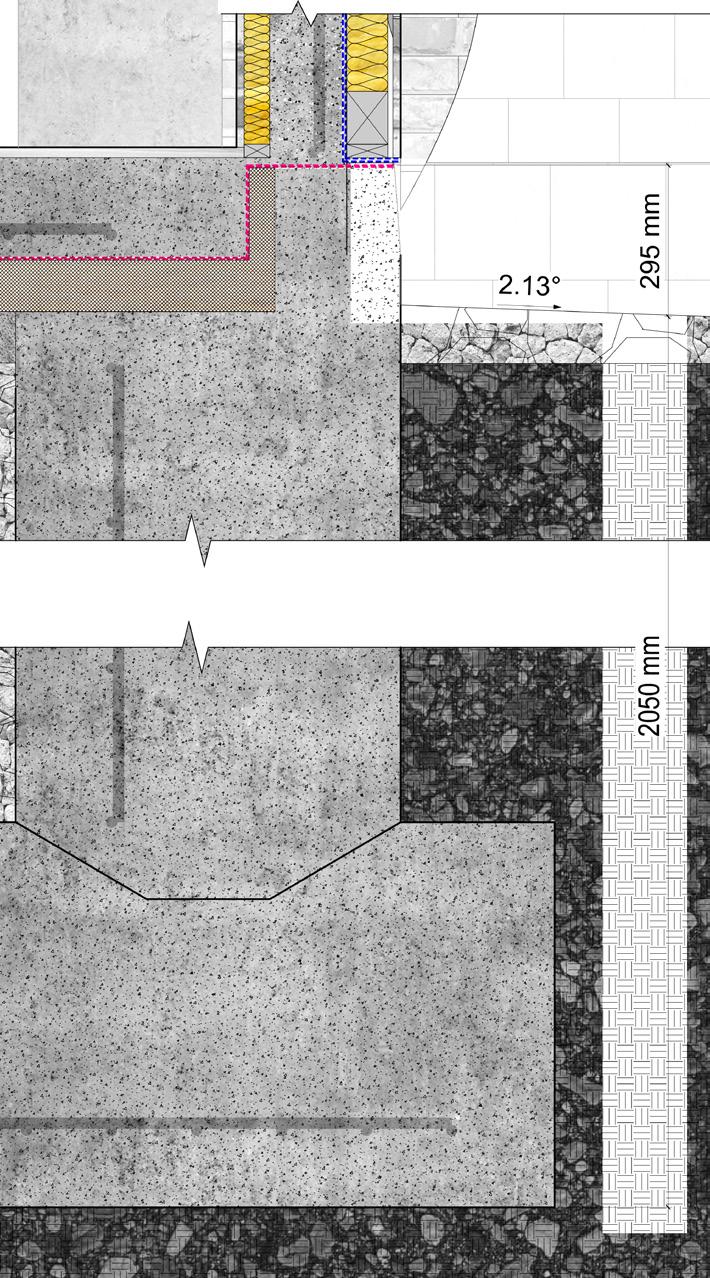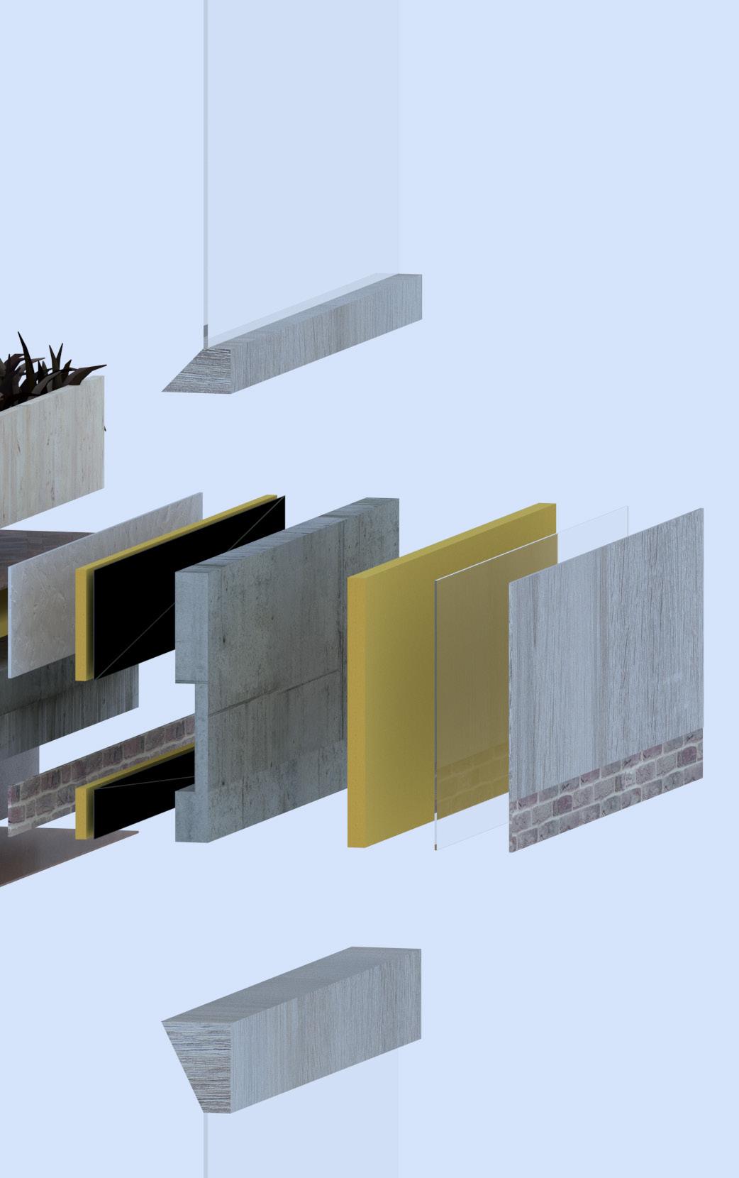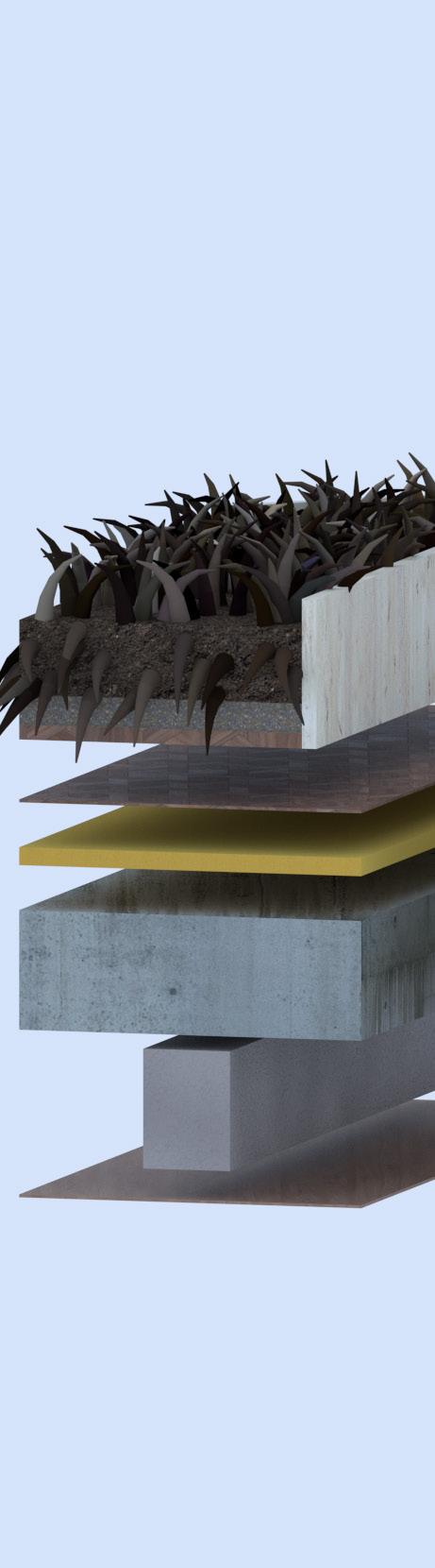 The two structures will sit on concrete strip foundations as this will allow for the load of the buildings to be absorbed and distributed evenly in columns ranging the length of the building. The reception floor will be placed 295mm off the ground to reduce the spread of moisture and the walls will be protected by a Water Resistive properties, this will allow for the main structure to stay dry and no mould to build up as the necessary ventilation will be available. In terms of insulation the building will employ hemp insulation, this is due to the benefits found with the material, for the project specifically and of insulating a building. It further has many environmental benefits and comes from purely renewable resources while also having solid thermal This will create a wall assembly which will benefit from numerous sought after properties which will be felt inside the building once constructed The roof detail replicates much of the same practise used for the rest of the building. It will have however, a larger concrete structure in order to heavy weight associated with planting vegetation. But also, depth enough in the floor itself to place the necessary aspects to create a successful and long-term use. This is why the green roof employs a mix of drainage systems, filter layers and waterproofing. Protecting the structure of the the elements as a result of the incline of the structure and the drainage layer of the green roof. The project aims to deliver a community centre of high quality for the residents and visitors of Salford alike, it is therefore important that the building out of the space and structure while considering specific needs of the area and locally available materials. This can be seen with the extra precautions terproofing/membrane layers or the choice of materials due to their thermal abilities and methods of self-regulating temperature.