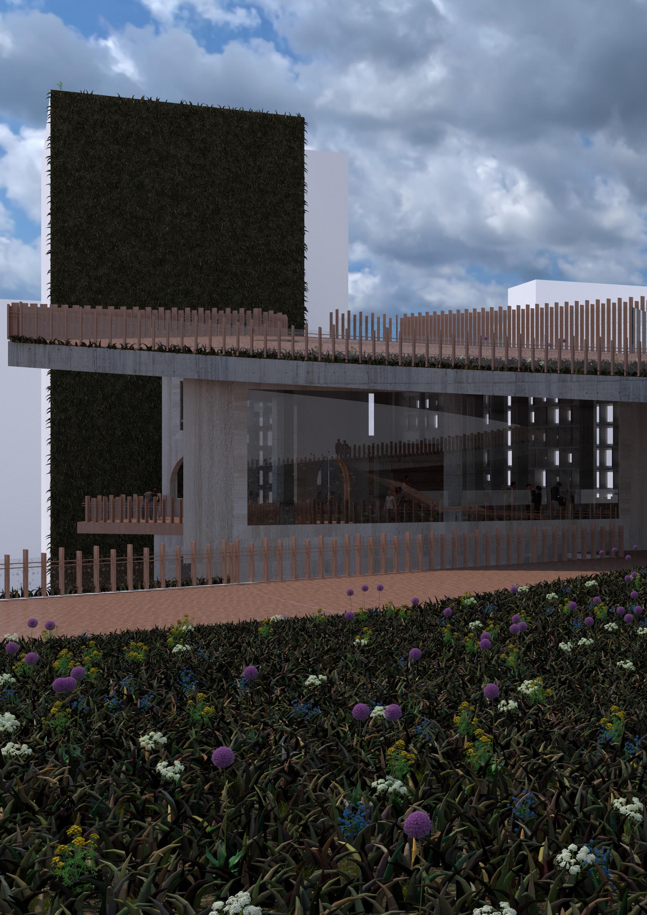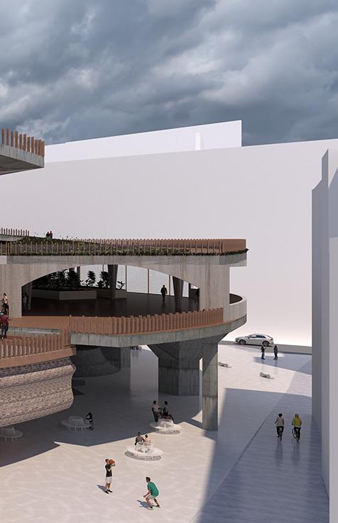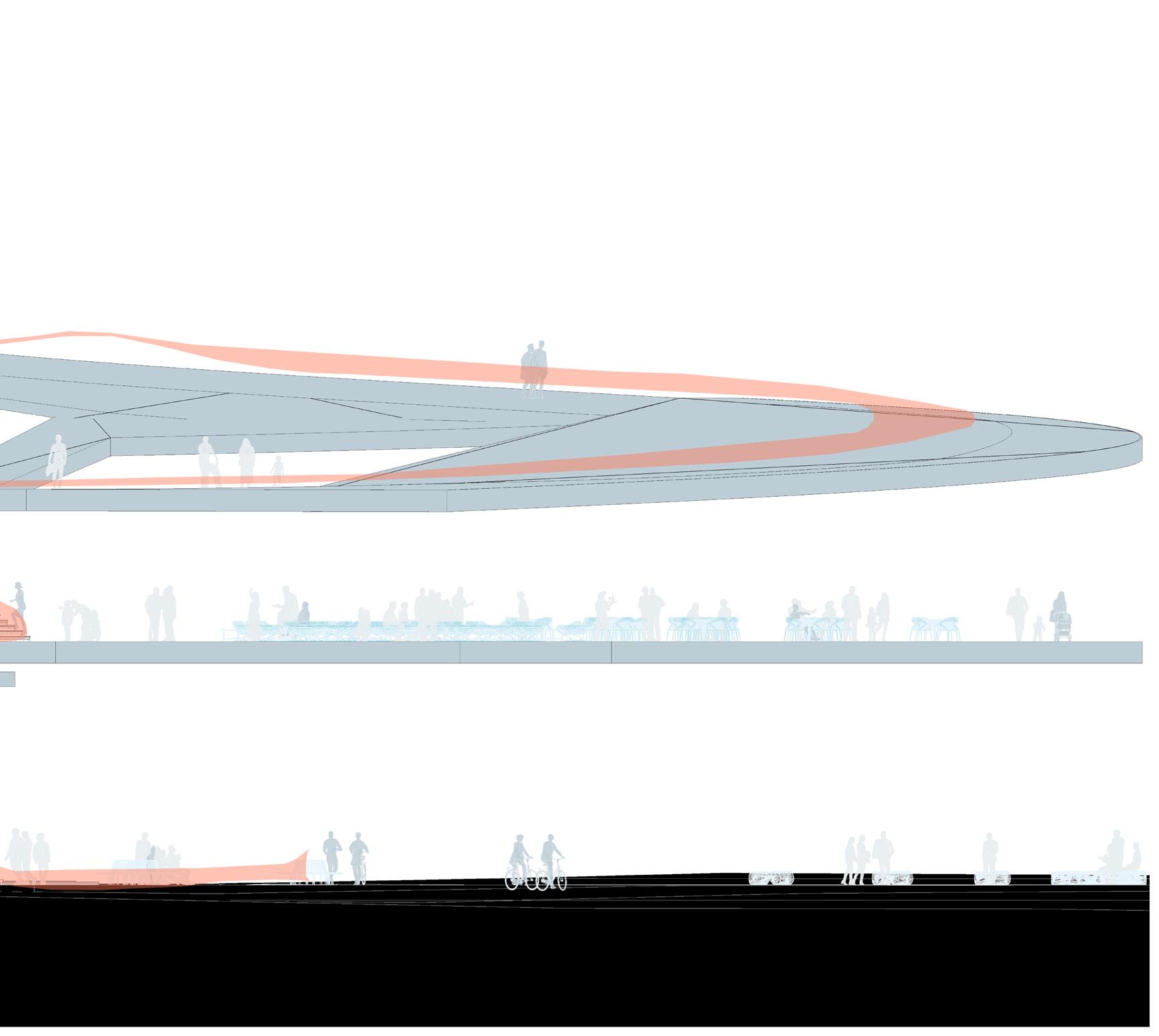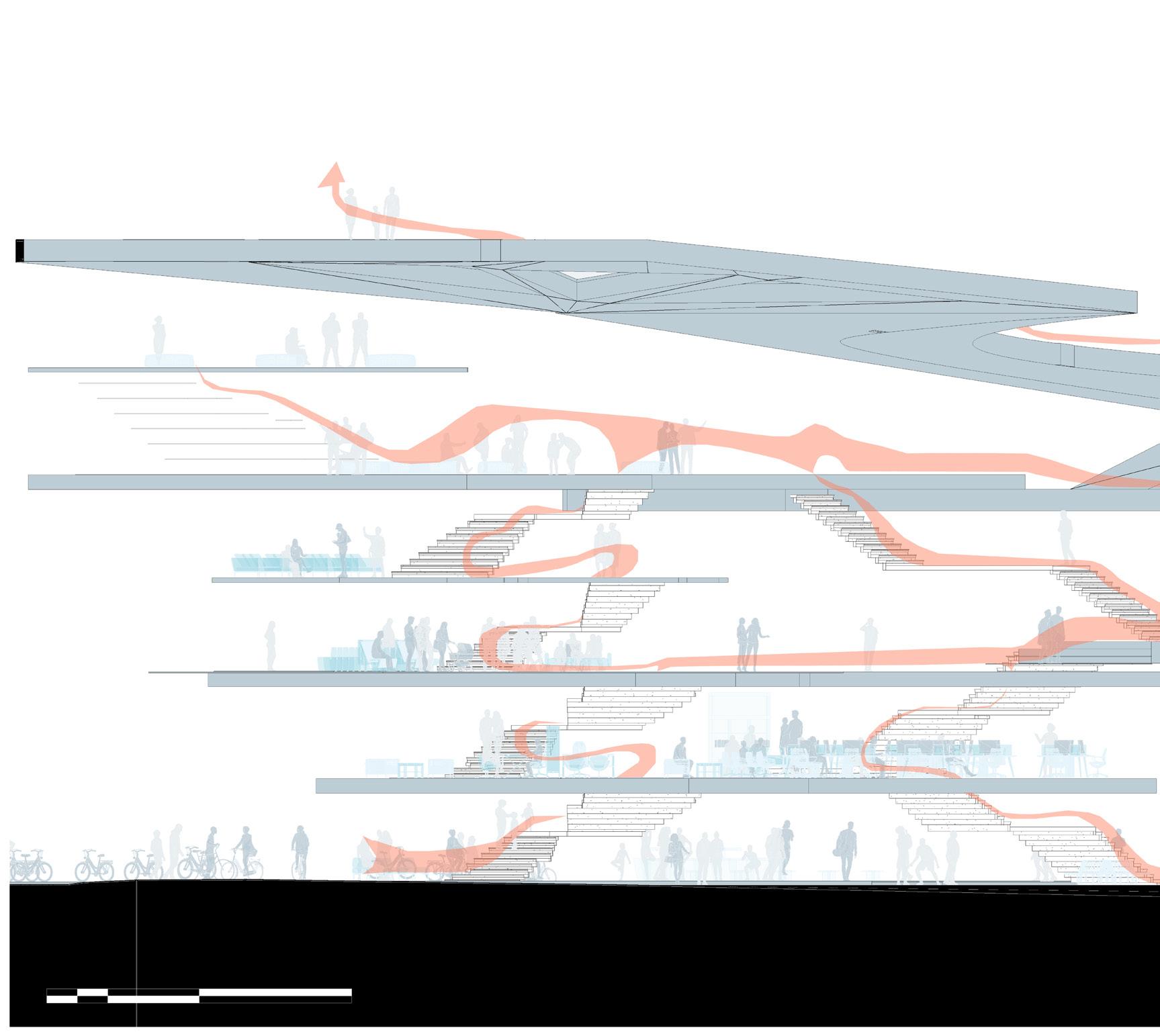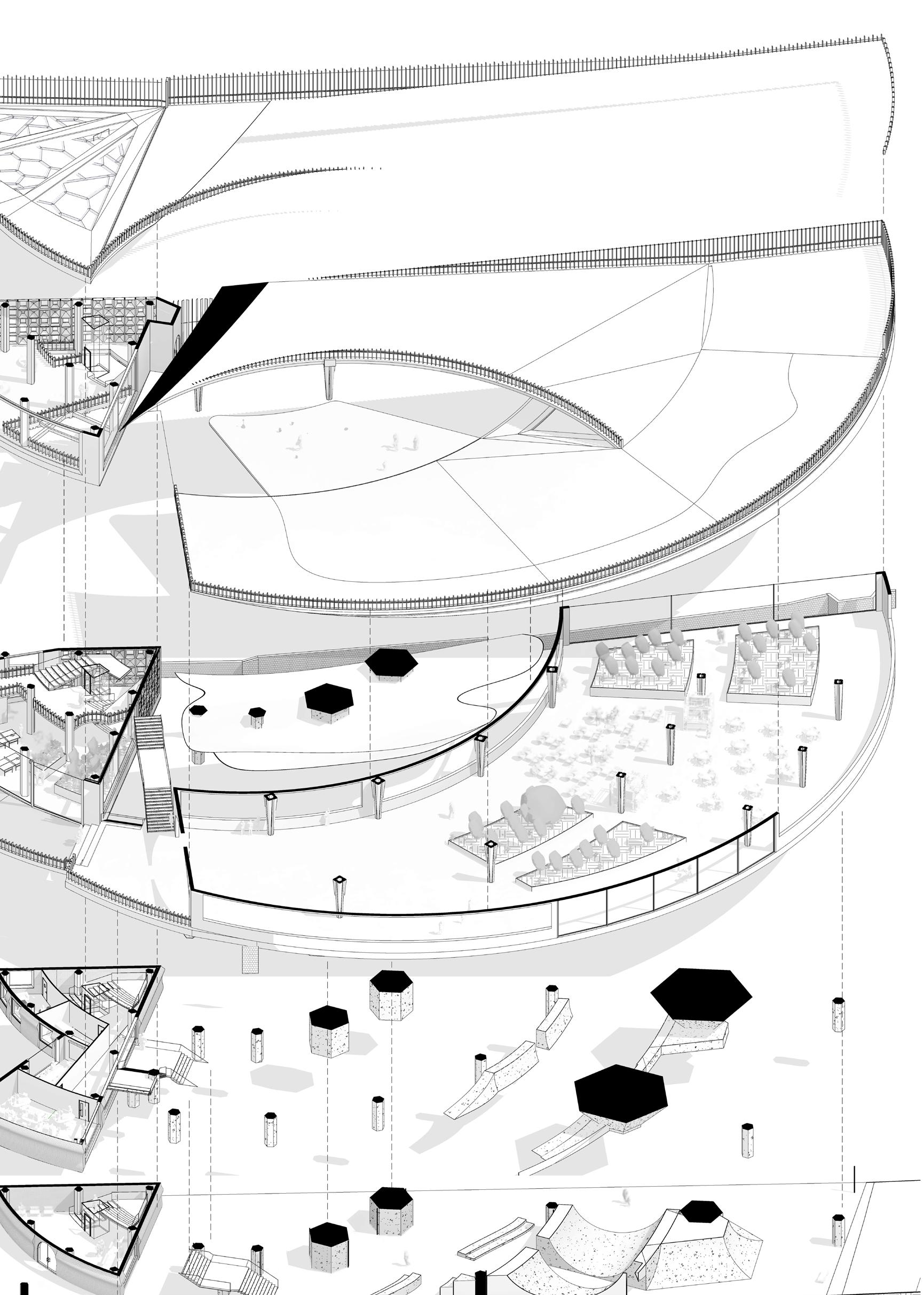 The elevated park to the West will consist of 3 levels. Starting at the community centre’s second level it will connect the structures and allow access to a covered café area in which plants are planted. The next level will connect the top floor of the community centre and be a green space, this will connect up to the roof as can be seen in South East Section 1:1000.