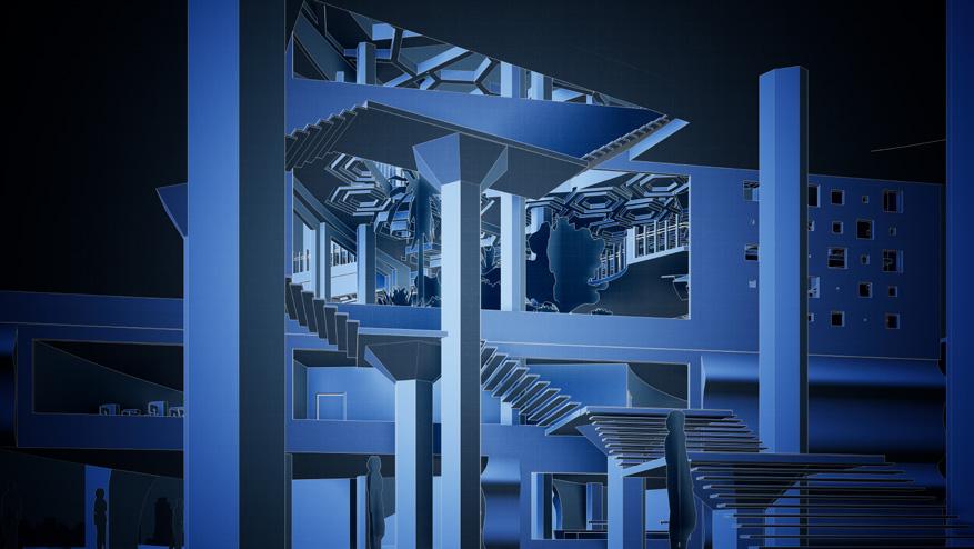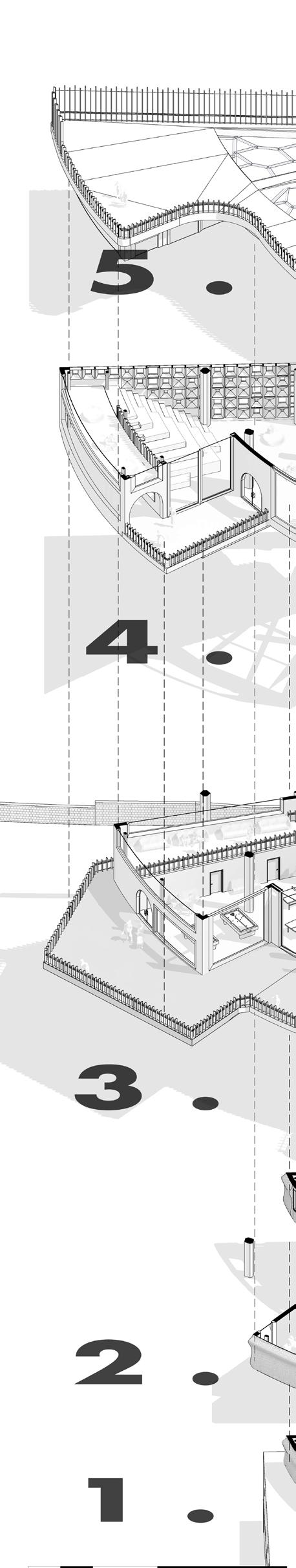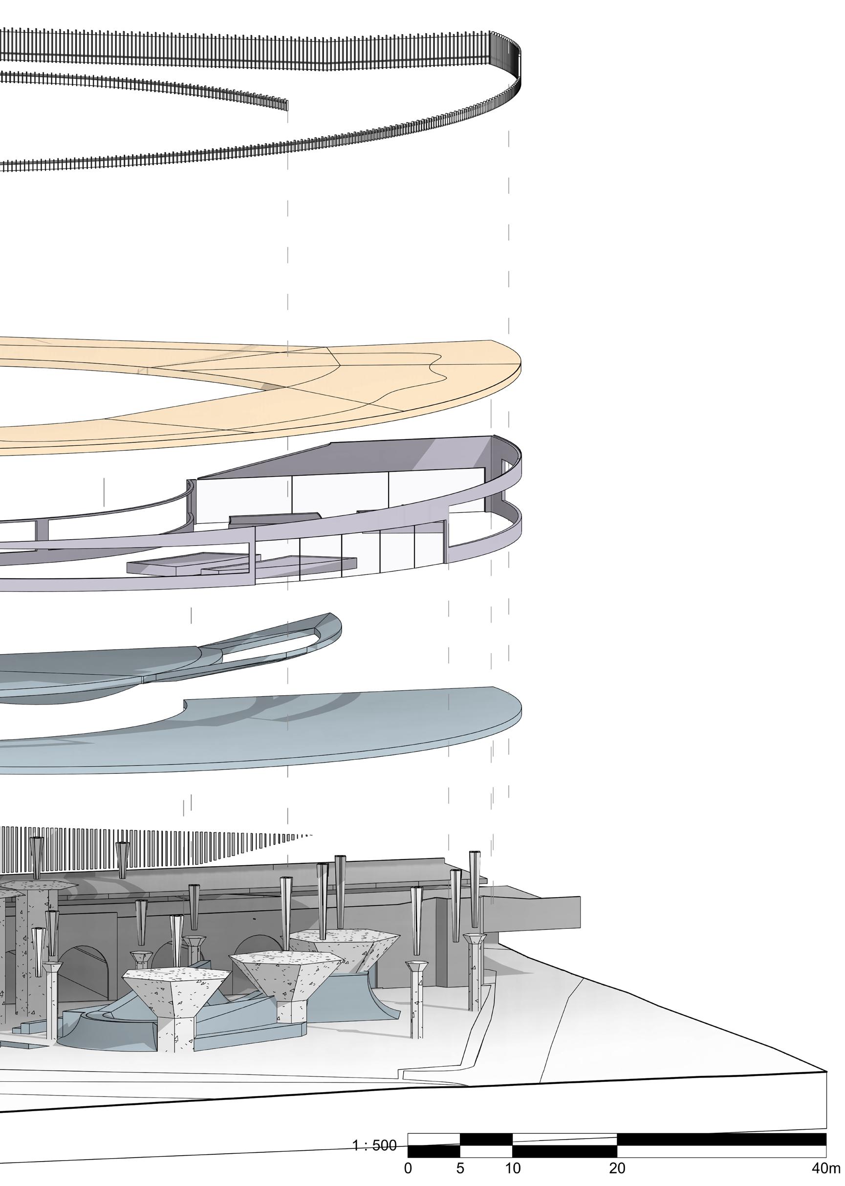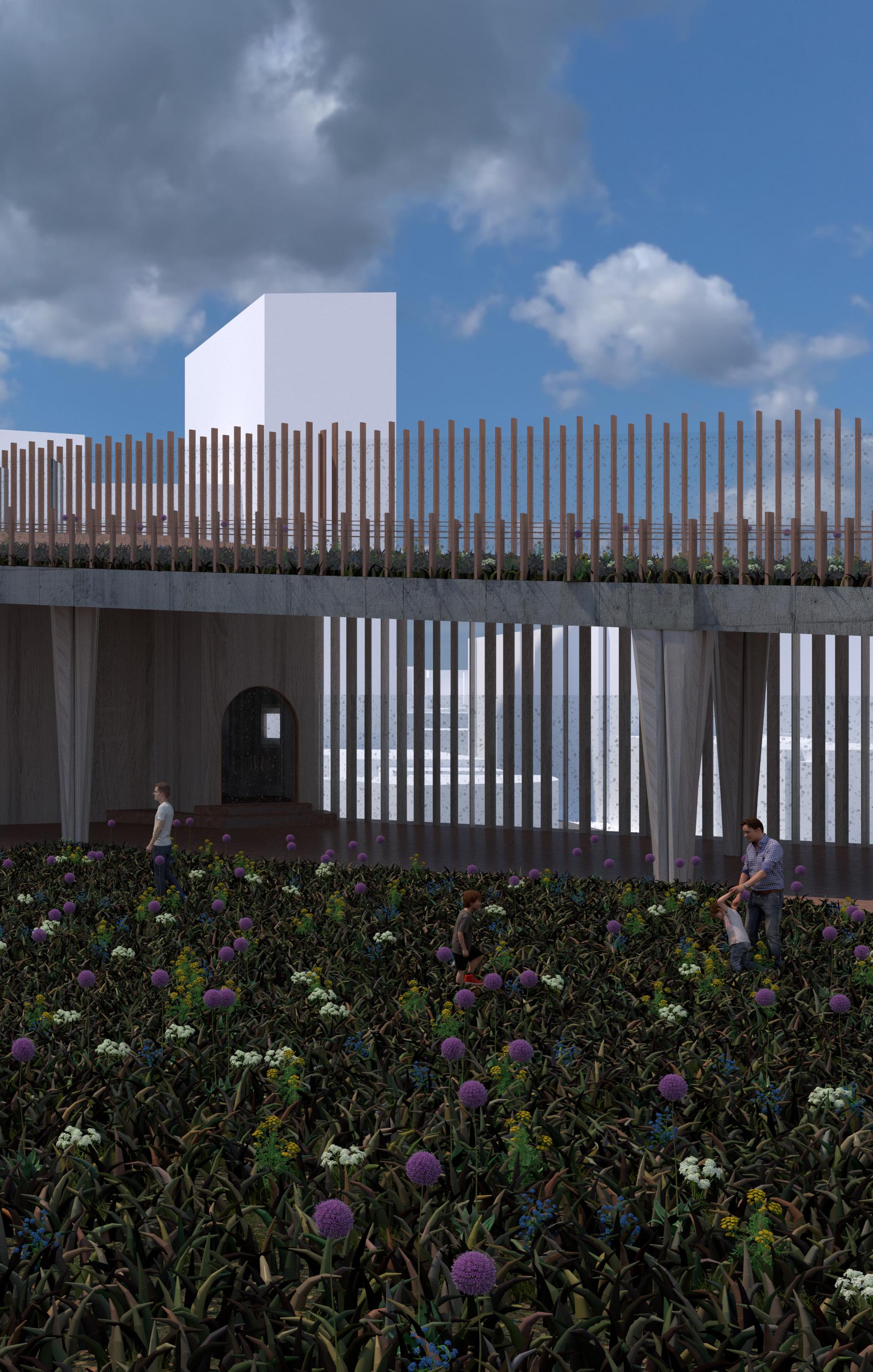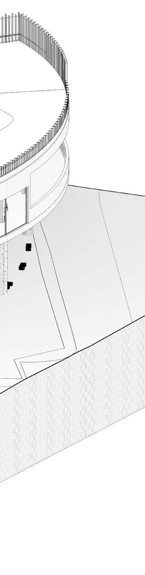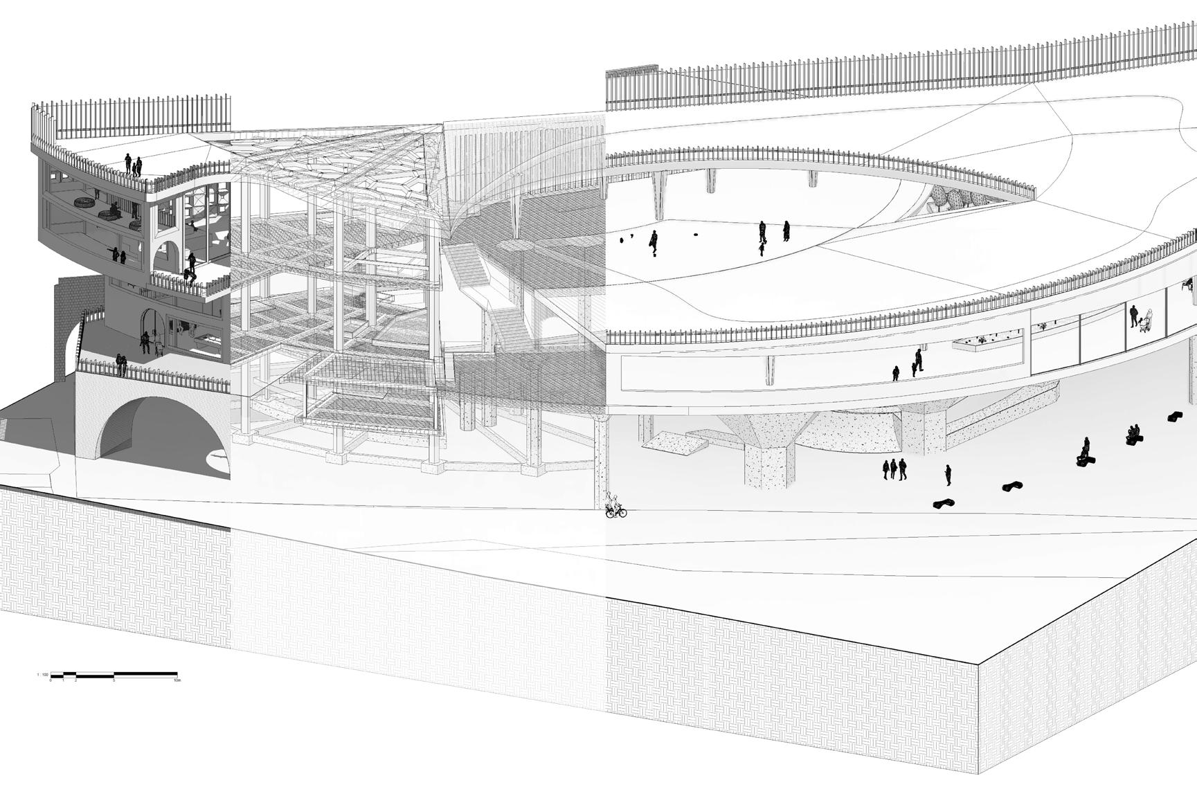 The elevated park to the West will consist of 3 levels. Starting at the community centre’s second level it will connect the structures and allow access to a covered café area in which plants are planted. The next level will connect the top floor of the community centre and be a green space, this will connect up to the roof as can be seen in South East Section 1:1000.
