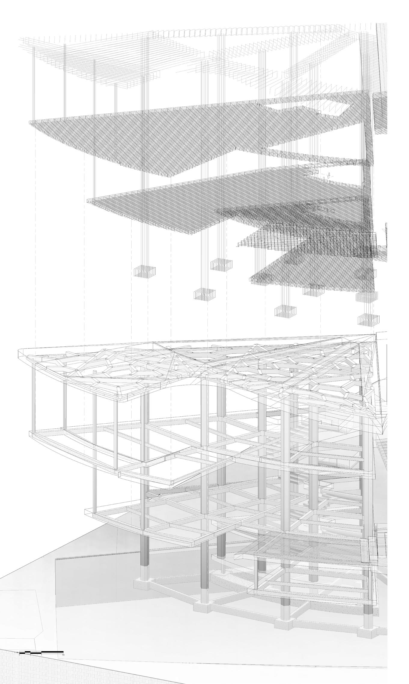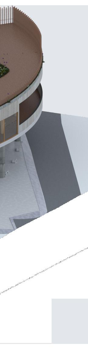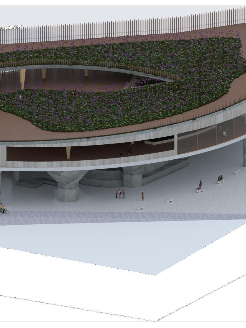 The project will consist of one main structure where the community centre will be based to the West of the site and an elevated park area to the East. The main material used for the structure of the two areas is concrete as it can maintain heavy loads. Rebar will be placed inside to support the frame of the structure and enable connections. Beams and columns will also utilise Epoxy in order to connect and provide high strength and adhesion properties between the two elements. The windows will be triple glazed and have a wooden frame which will be varnished to withstand the elements.