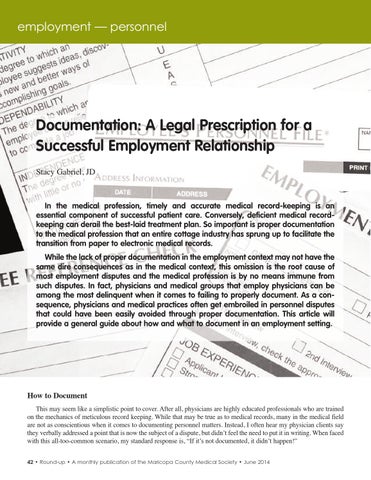 This may seem like a simplistic point to cover. After all, physicians are highly educated professionals who are trained on the mechanics of meticulous record keeping. While that may be true as to medical records, many in the medical field are not as conscientious when it comes to documenting personnel matters. Instead, I often hear my physician clients say they verbally addressed a point that is now the subject of a dispute, but didn’t feel the need to put it in writing. When faced with this all-too-common scenario, my standard response is, “If it’s not documented, it didn’t happen!” 42 • Round-up • A monthly publication of the Maricopa County Medical Society • June 2014