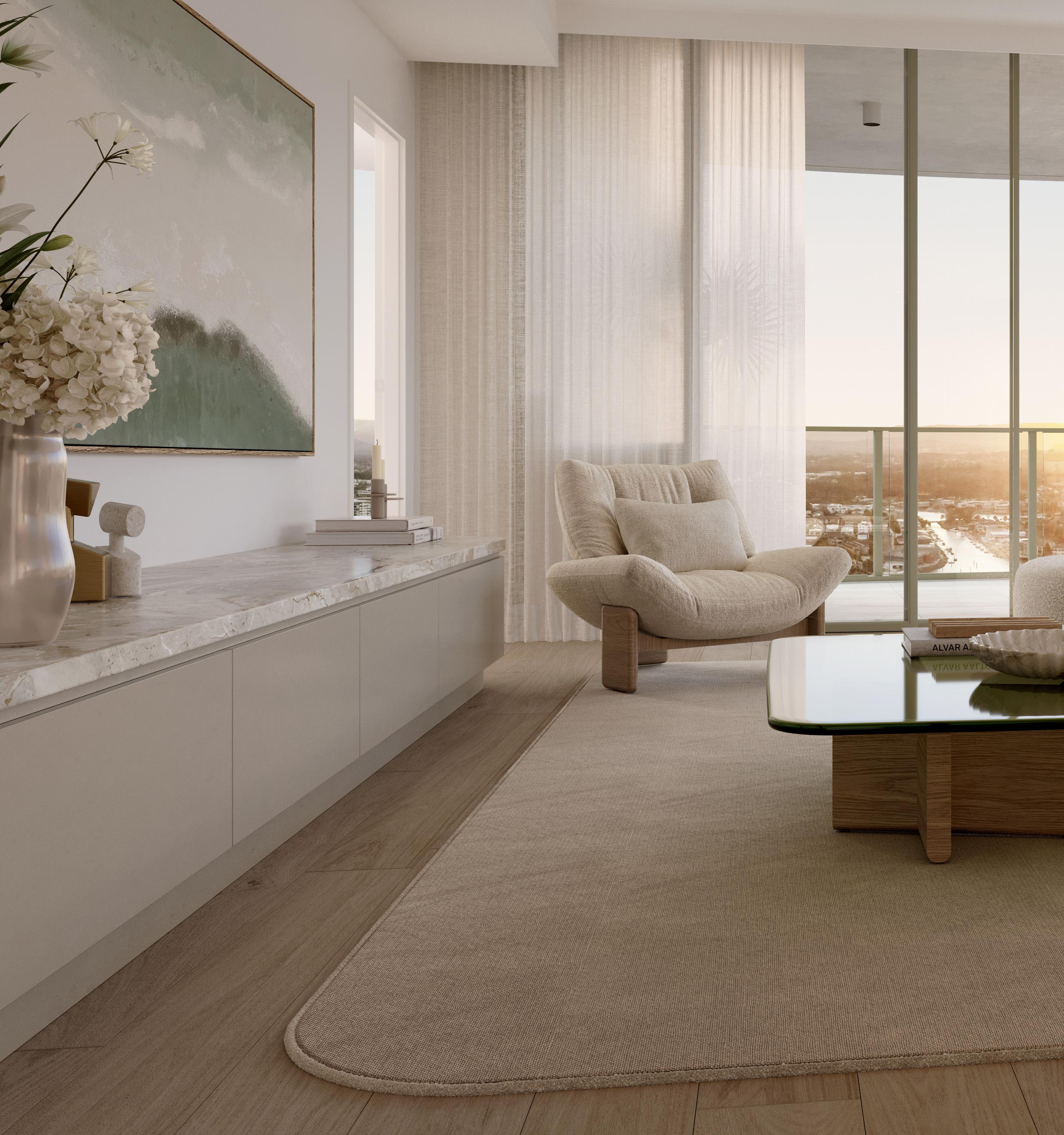 With just ten premium residences where elevated living meets timeless design. Spanning half a floor, each residence features four spacious bedrooms and is positioned to embrace breathtaking panoramic views across the ocean, broadwater, and hinterland.