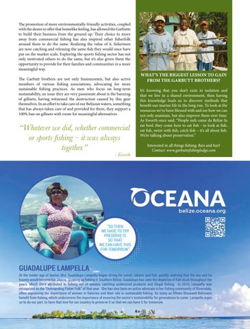 WHAT’S THE BIGGEST LESSON TO GAIN FROM THE GARBUTT BROTHERS? It’s knowing that you don’t exist in isolation and that we live in a shared environment, then having this knowledge leads us to discover methods that benefit our marine life in the long run. To look at the resources we’ve been blessed with and see how we can not only maintain, but also improve them over time. As Eworth once said, “People nuh come da Belize fu eat beef, they come here to eat fish - to look at fish, eat fish, swim with fish, catch fish – it’s all about fish. We’re talking about preservation.” Interested in all things fishing, flats and fun? Contact: www.garbuttsfishinglodge.com