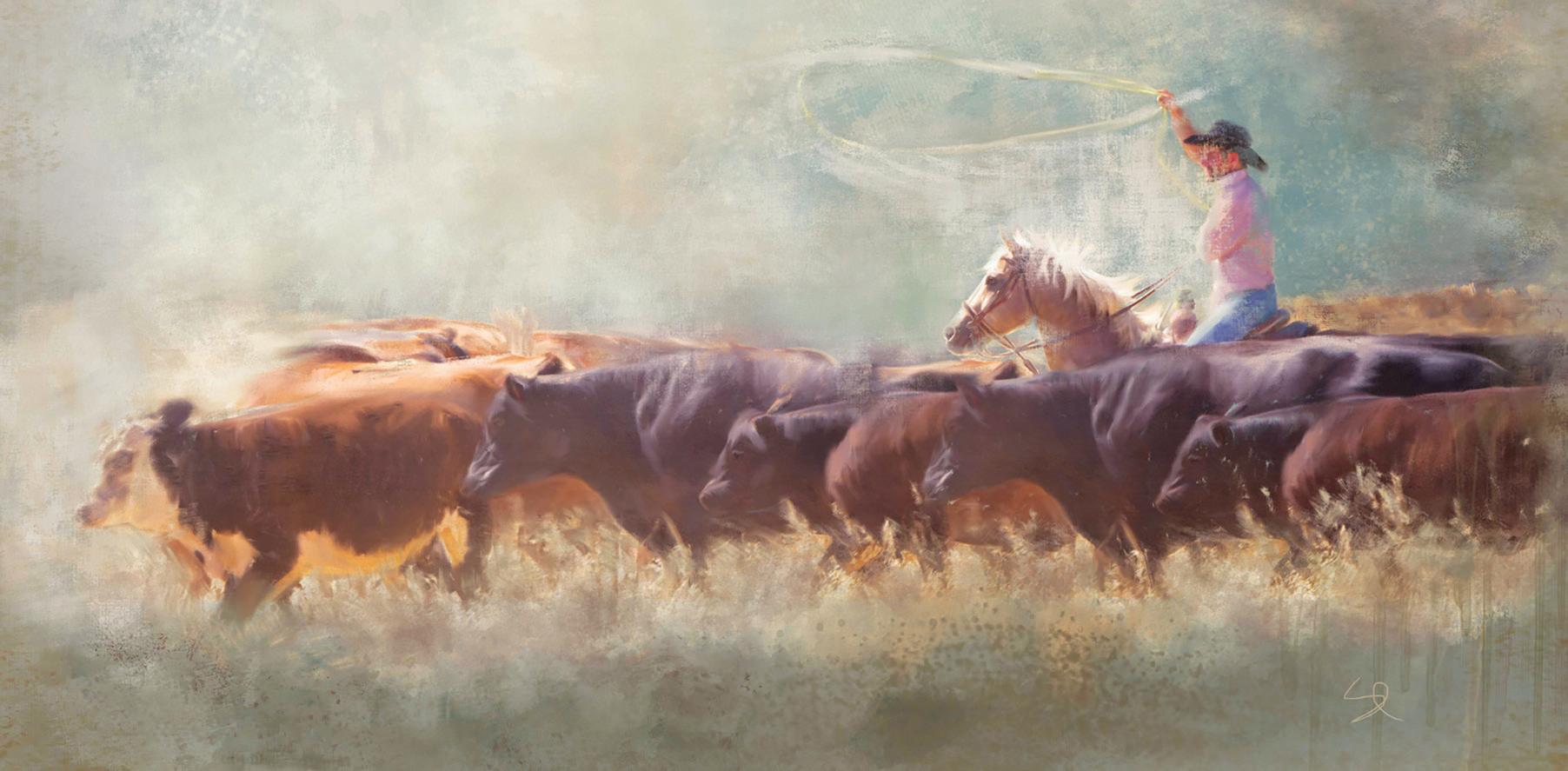 She brings these elements together for “En la Luz,” portraying a woman on horseback, her full skirt spread in a full circle around her, the “brushwork” imparting dreamy motion. The realization that this began as a photograph of someone’s loved one makes the story in this image tender and poignant. In a thrilling scene, a “Hard Working Pony” and rider round up the herd pounding by, dust flying and the cowboy circling his lasso before its release.