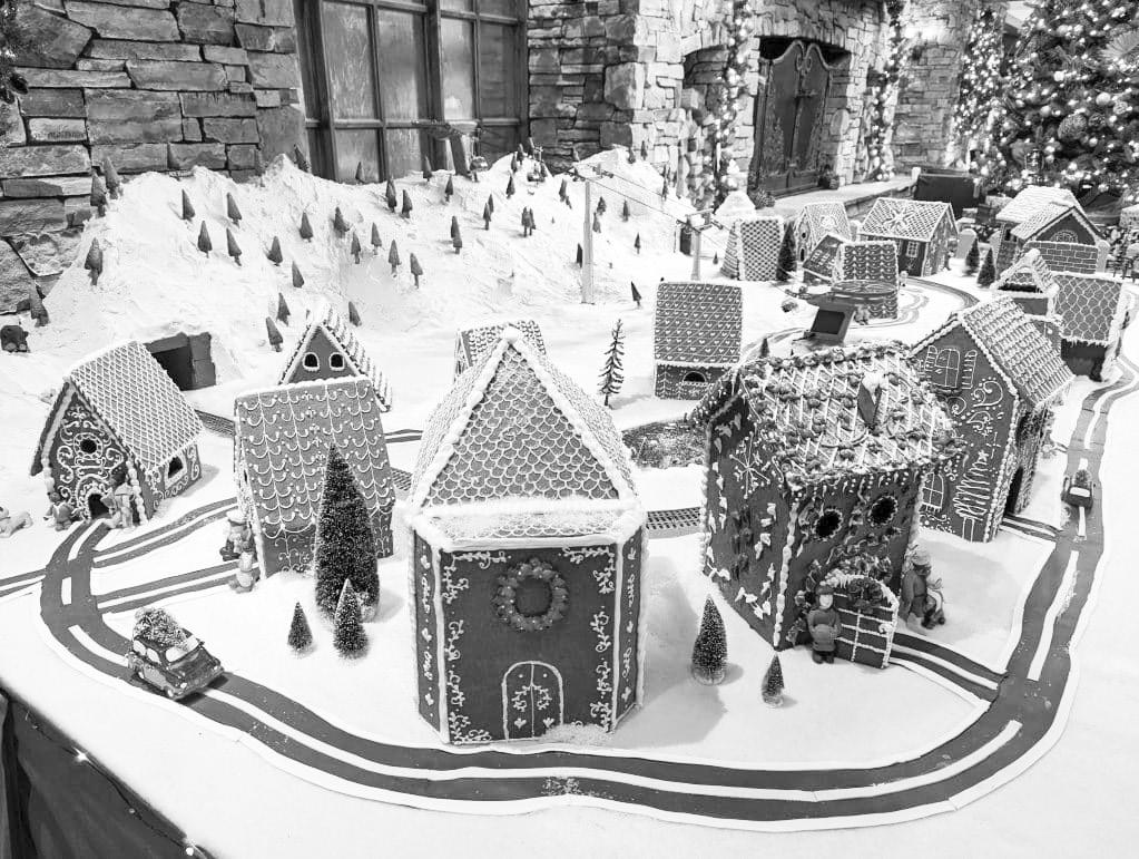 Each year, our team develops an extravagant gingerbread village display with a unique theme. This year’s gingerbread display showcases a snow village complete with snowy cottages and a train. The structure features over 252 pounds of marshmallows, 110 pounds of powdered sugar, 83 pounds of butter, 80 pounds of flour, 32 pounds of Rice Krispies, 30 pounds of eggs, 26 pounds of brown sugar and more.