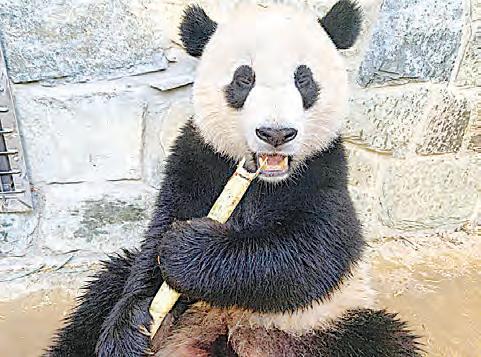 Giant panda Xiao Qi Ji, who’s now 2 years old, bites down on a piece of sugar cane at the National Zoo.
