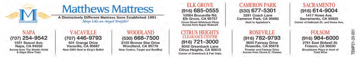 number of types of sources found within residential neighborhoods are capable of producing enough adult mosquitoes to bother not only the residents of one home but a number of homes in the area. These mosquitoes are also capable of transmitting West Nile virus! Water left standing for seven to ten days can produce mosquitoes during warmer weathaer. There are a number of simple precautions that can be taken to prevent this from happening... 707.437.1116 SOLANOMOSQU ITO.CO M HE LP US FIGHT THE BITE this season by reporting dead birds to the West Nile Virus Call Center at 1- 80 0-WN V- BIRD or go online to westnile .ca.gov to report elec tronic ally. Dead birds are an import ant tool for early virus detection. Birds ac t as a reservoir for We st Nile virus, infecting the mosquitoes that feed on them. Dead birds are of ten the first indicator that West Nile virus may be present in an area SACRAMENTO CAMERON PARK ELK GROVE UP TO 70% OFF SACRAMENTO CLEARANCE CENTER A Distinctively Different Mattress Store Established 1991 www.MatthewsMattress.com FREE DELIVERY • SET-UP • REMOVAL L OF OLD BED EXCLUDES SUNDAYS • 30 MILE RADIUS $600 MINIMUM PURCHASE BUY BY 5 PM SLEEP BY 9 PM Family Owned and Operated Since 1991 We Will Any Advertised Mattress PRICE! PRICE! BEAT BEAT We will beat any advertised price by 10%. This offer expires 4/30/23. With $600 minimum purchase. Not valid on prior sale s. See store for det ails. 36 MONTHS SPECIAL FINANCING With credit approval. See store for details. Expires 4/30/23 Photos for illustration purposes only. THANK YOU FOR VOTING US #1 MATTRESS STORE 16 YEARS IN A ROW! * In multiple reader polls. MattressCLOSEOUTS! OFF ALL REMAINING FLOOR MODELS & SELECT ADJUSTABLE BASES* L L OFFALLREMAINING SAVE 30-50% ON SELECT TEMPUR-breeze® MATTRESSES SEE STORE FOR DETAILS.
