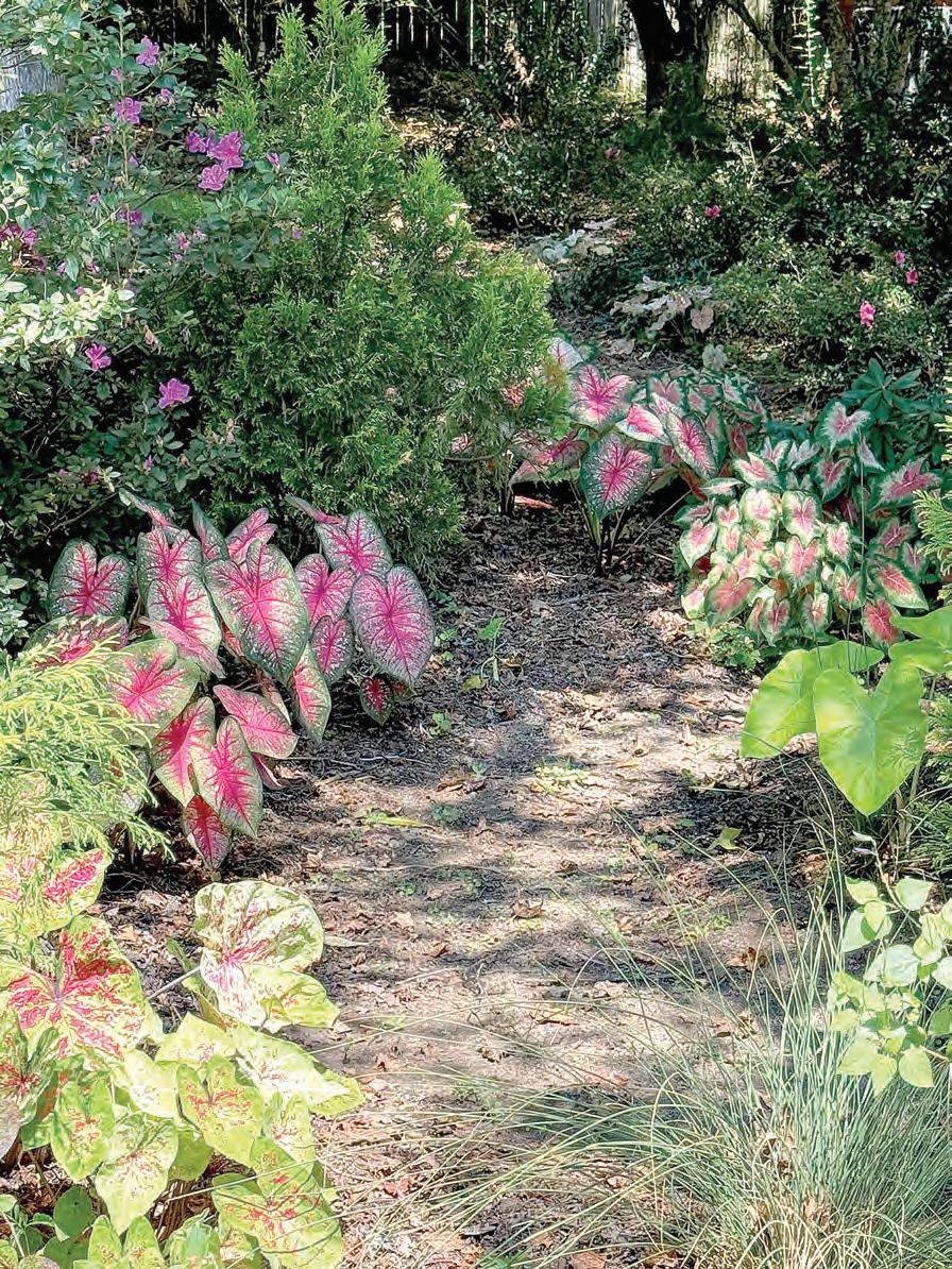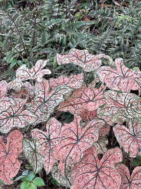 ABOVE: Heavy rains along a slope created the opportunity for The Garden Guy to create a “River of Caladiums” in West Georgia. Heart to Heart Rose Glow caladiums were planted in areas where loamy soil was washed into a miniature alluvial-like flood plain. NORMAN WINTER/TNS PHOTOS