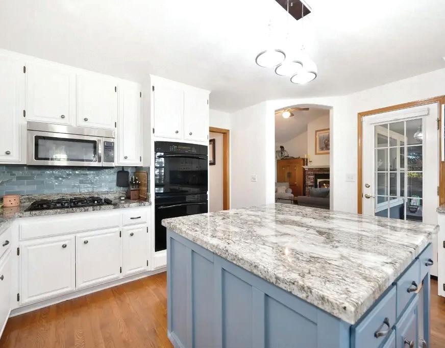 and Hwy 80. Laminate ooring throughout main areas. Kitchen features marble countertops with gorgeous herringbone tile pattern at backsplash, stainless steel appliances, and wood counter at