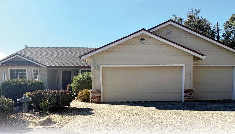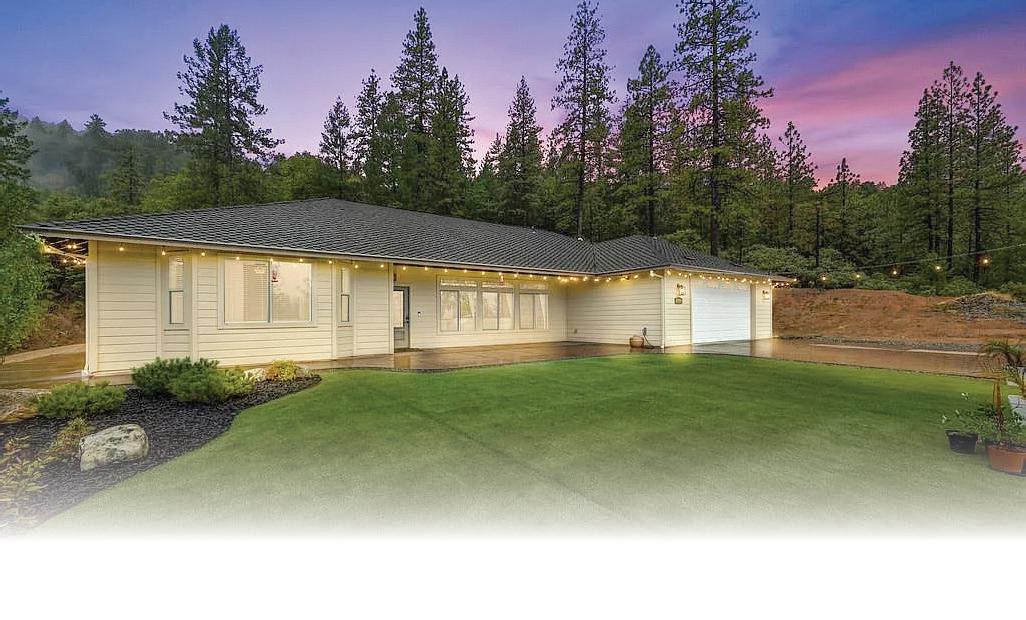 Located on 5+ acres on a hill above the Cold Springs Golf Course, this home features a 3 car garage plus a detached workshop/RV garage with a seasonal creek running along. Very clean 3 bedrooms, plus an of ce, living room with a gas log stove and a deck to enjoy the beautiful views