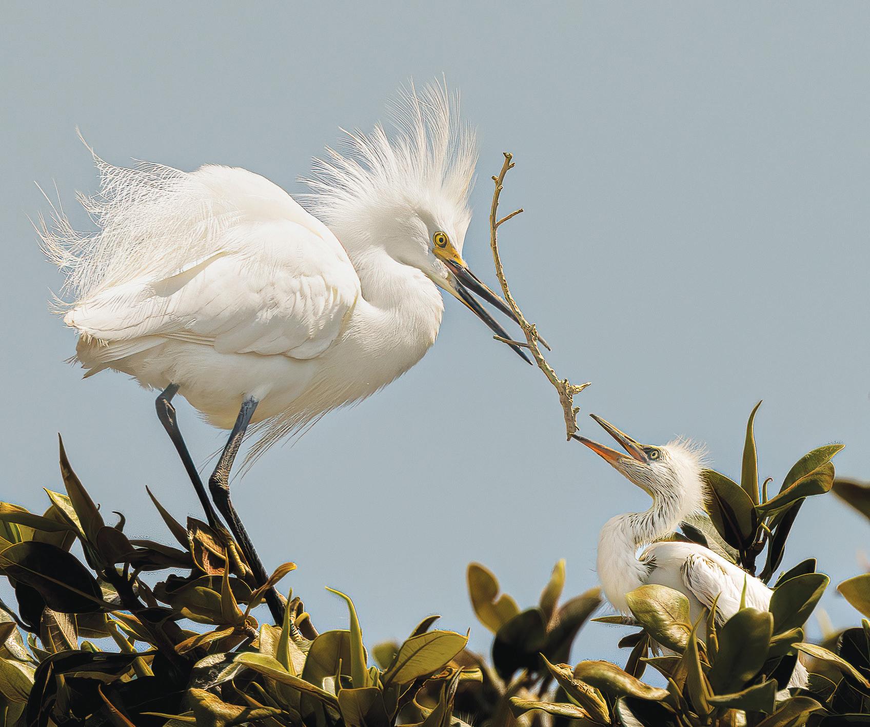 How fun to find this snowy egret chick and its siblings. Even more fun to watch the parent fly in with a stick. The parent kept moving the stick to have the chick follow it and try to grab it. Canon R6, RF 100-500mm, 500mm, 1/1250 sec, f8, ISO 320. To learn more about McGaffigan visit instagram.com/KathyMcGaffigan.