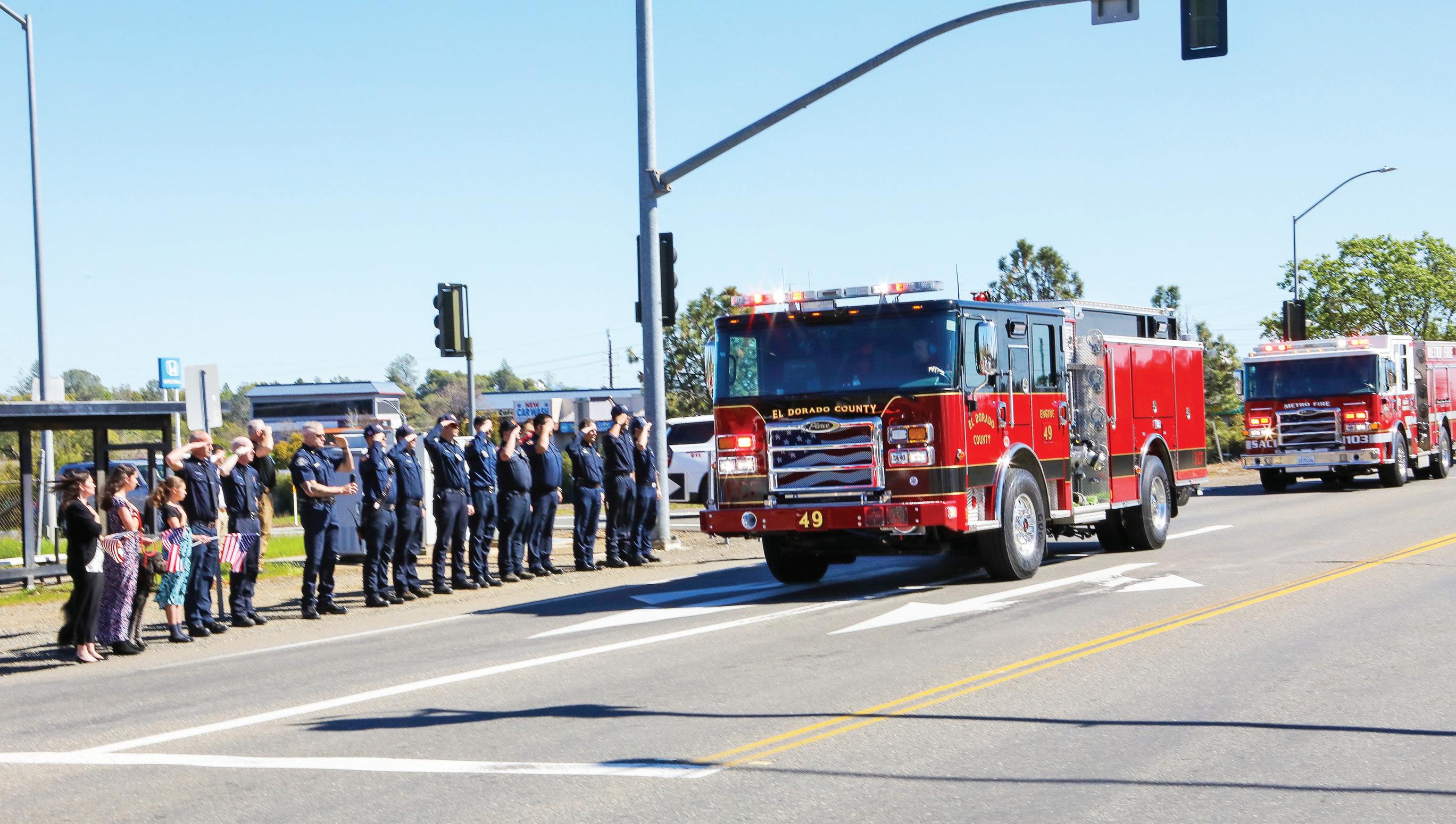 Firefighters from El Dorado Hills, Georgetown, Rescue and Garden Valley fire departments gather on Ponderosa Road with family friends of late firefighter Lucas Shepard, 43, of Rescue to honor the family as they returned home. Shepard died March 14 while on a family vacation in Hawaii. According to Georgetown Fire Chief Glenn Brown, Cal Fire firefighters were stationed near the family’s home and there were mourners on