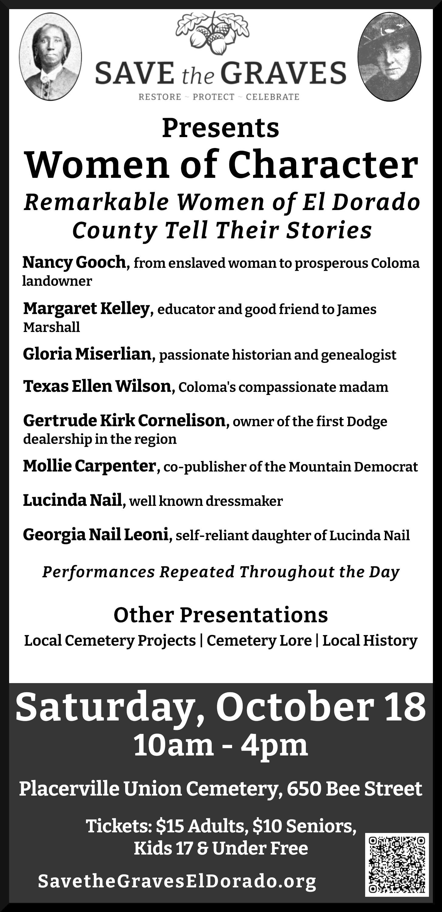 Save the Graves will host Women of Character at Placerville Union Cemetery from 10 a.m. to 4 p.m. For more information visit savethegraveseldorado.org.