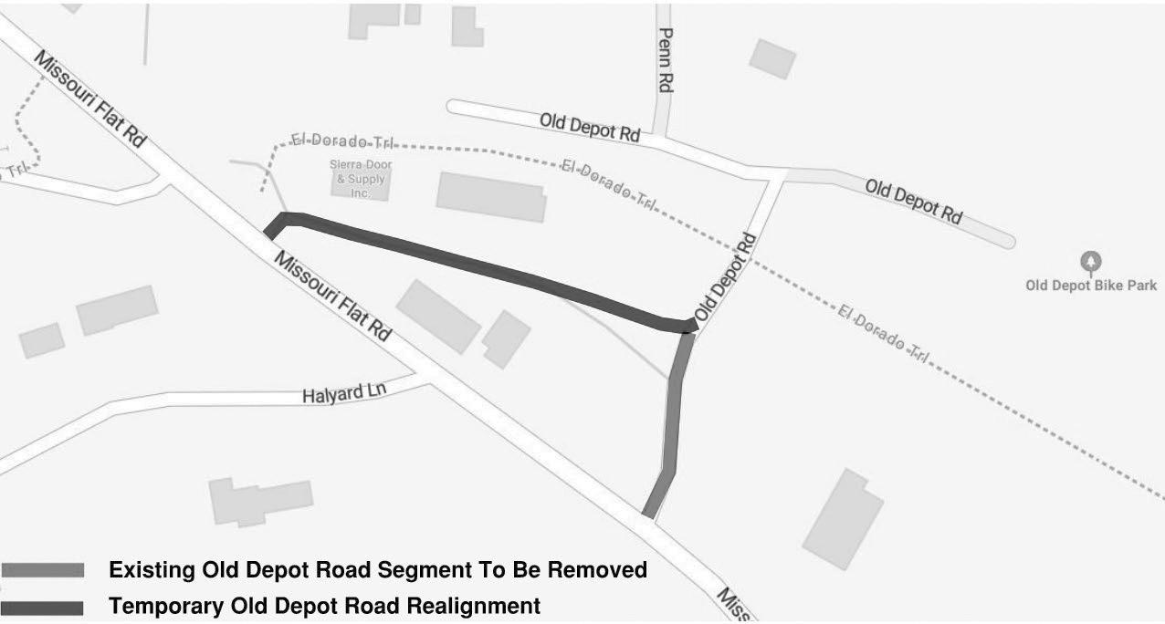 The existing intersection of Old Depot Road with Missouri Flat Road will move approximately 600 feet northwest to the existing Sierra Door & Supply driveway. Detour signage will be installed in both directions of Missouri Flat Road approaching Old Depot Road alerting drivers of this change.
